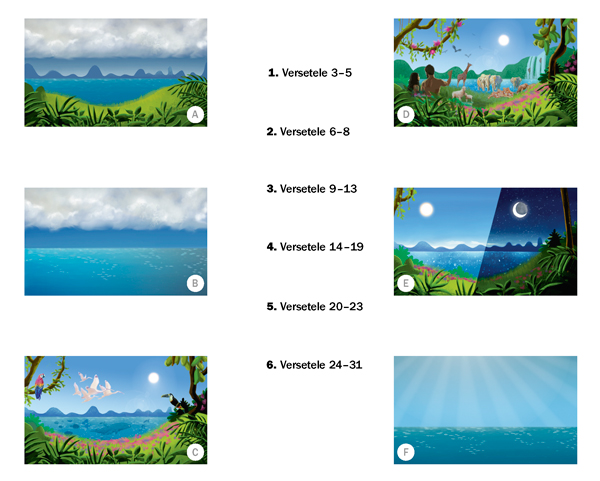 Citiţi Geneza 1:1–31. Trageţi o linie de la fiecare imagine la versetele corespunzătoare. (Imaginile nu sunt în ordinea corectă.)