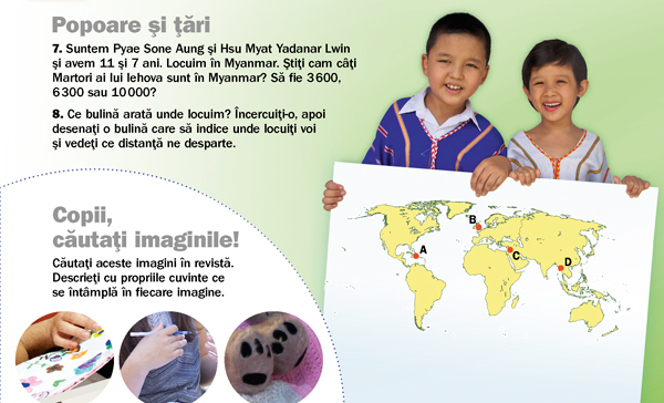 Suntem Pyae Sone Aung şi Hsu Myat Yadanar Lwin şi avem 11 şi 7 ani. Locuim în Myanmar. Ştiţi cam câţi Martori ai lui Iehova sunt în Myanmar? Să fie 3 600, 6 300 sau 10 000?