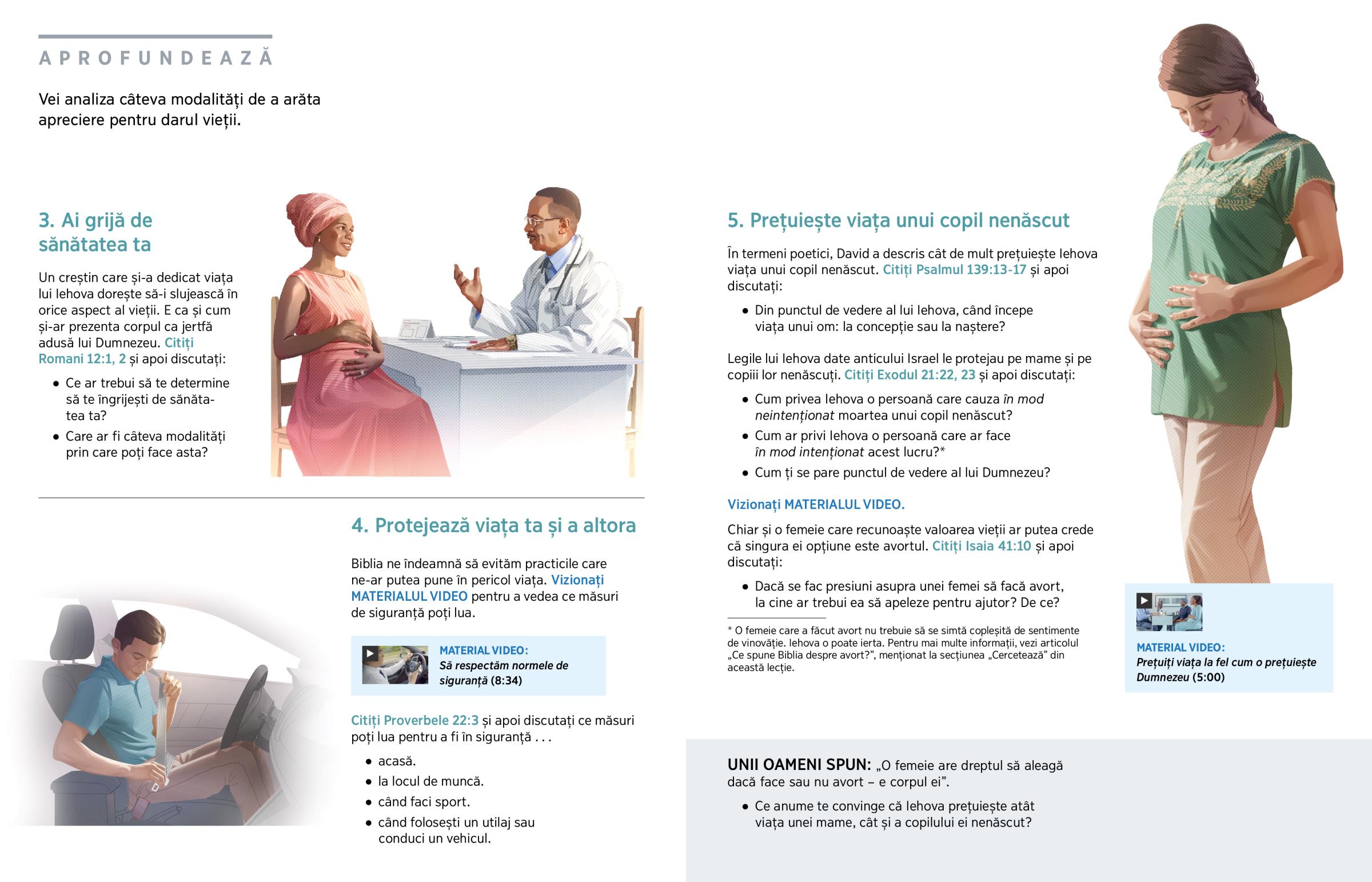 Iehova a prețuit viața ta încă din momentul în care ai fost conceput. Sub inspirație divină, David, un slujitor al lui Dumnezeu, i-a spus: „Ochii tăi m-au văzut chiar și când eram un embrion”. (Psalmul 139:16) Viața ta este foarte prețioasă în ochii lui Iehova. (Citiți Matei 10:29-31.) Iehova ar suferi profund dacă cineva, în mod intenționat, ar pune capăt vieții altei persoane sau chiar propriei vieți.a (Exodul 20:13) De asemenea, dacă ne-am pune în mod inutil viața în pericol sau nu am lua măsuri pentru a ocroti viața altora, l-am supăra pe Iehova. Când avem grijă de viața noastră și arătăm respect față de viața altora, dovedim că prețuim minunatul dar al vieții.