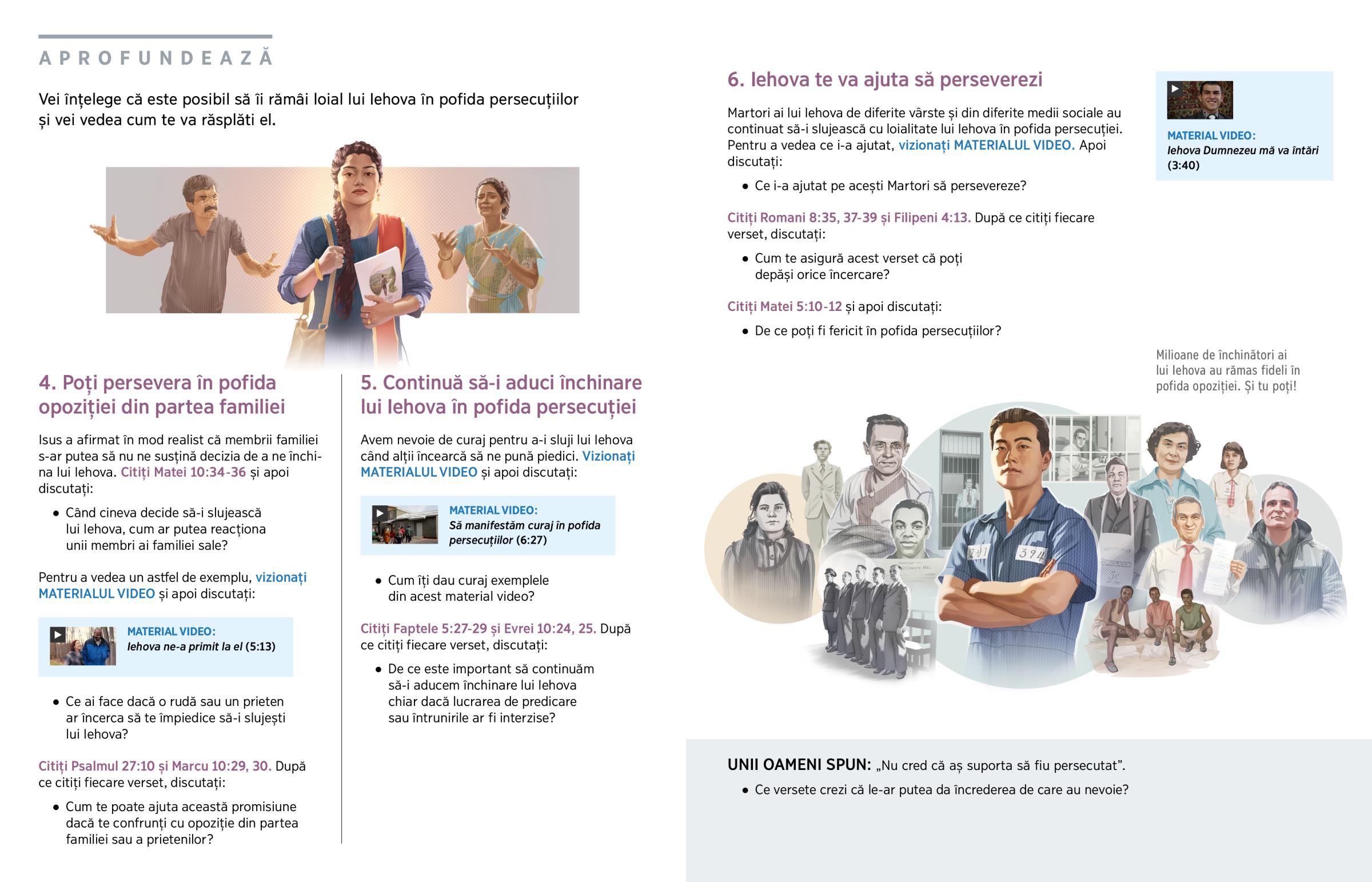 Trebuie să ne punem încrederea în Iehova încă de pe acum. Îți faci zilnic timp să te rogi lui și să citești un fragment din Cuvântul său? Asiști cu regularitate la întruniri? Aceste activități te vor ajuta să înfrunți plin de curaj orice persecuții, chiar dacă acestea vin din partea membrilor familiei. Apostolul Pavel, care a fost deseori persecutat, a scris: „Iehova este ajutorul meu; nu mă voi teme”. (Evrei 13:6)