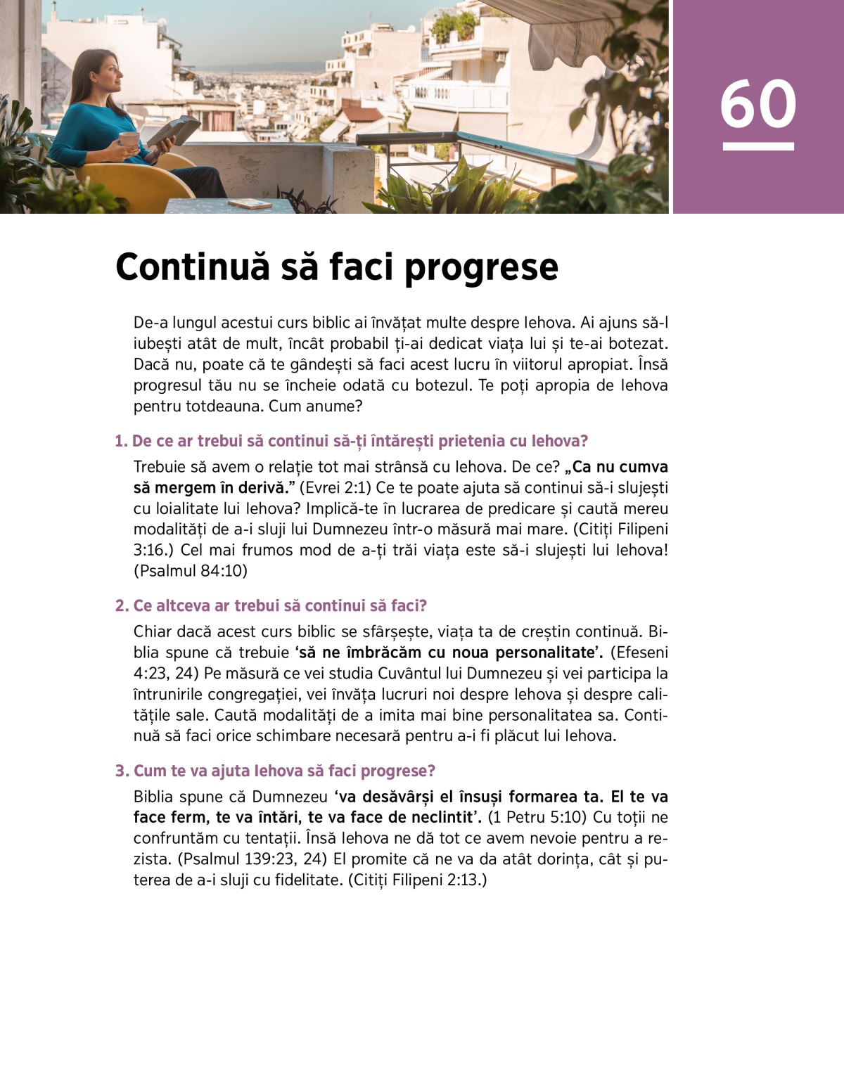 Chiar dacă acest curs biblic se sfârșește, viața ta de creștin continuă. Biblia spune că trebuie ‘să ne îmbrăcăm cu noua personalitate’. (Efeseni 4:23, 24) Pe măsură ce vei studia Cuvântul lui Dumnezeu și vei participa la întrunirile congregației, vei învăța lucruri noi despre Iehova și despre calitățile sale. Caută modalități de a imita mai bine personalitatea sa. Continuă să faci orice schimbare necesară pentru a-i fi plăcut lui Iehova.