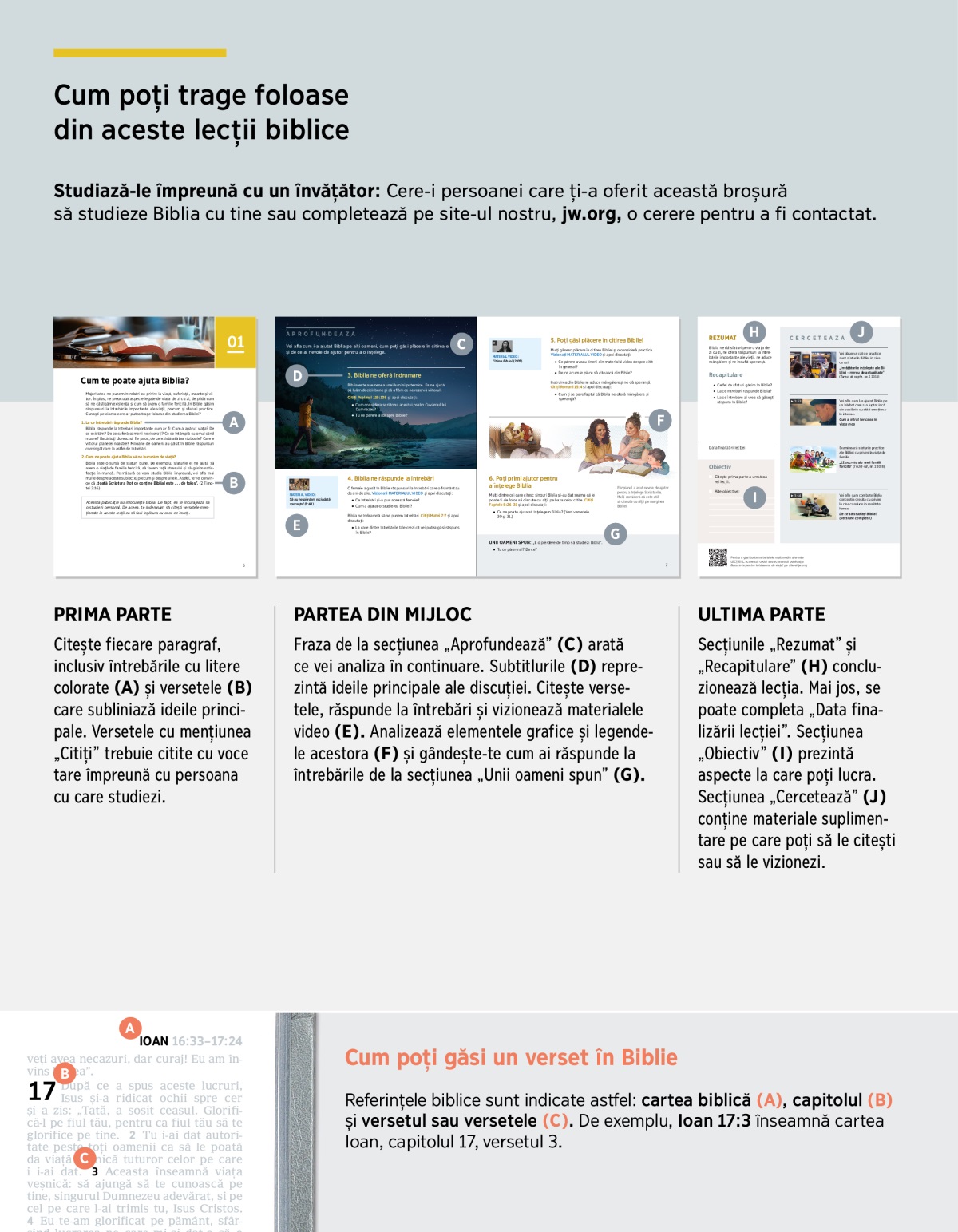 Studiază-le împreună cu un învățător: Cere-i persoanei care ți-a oferit această broșură să studieze Biblia cu tine sau completează pe site-ul nostru, jw.org, o cerere pentru a fi contactat.