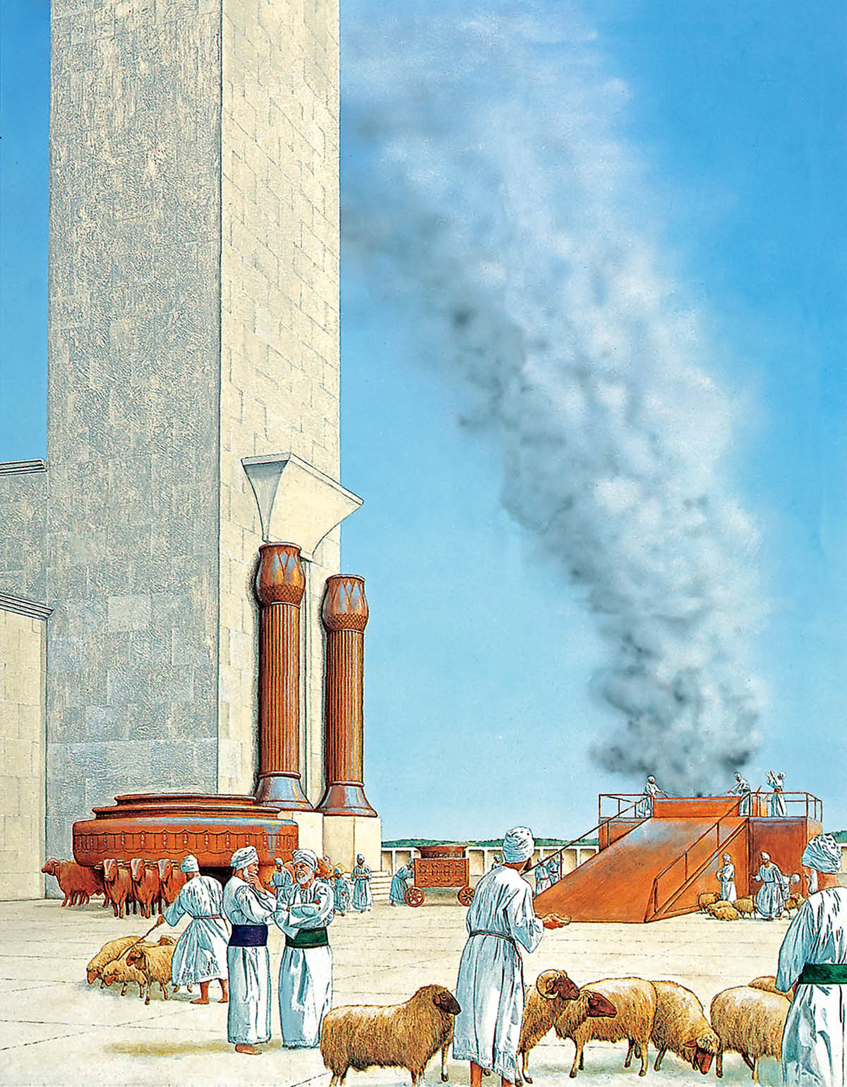 Vedere în interior a templului, un indiciu al frumuseții acestei structuri magnifice. În interior, pereții erau din lemn de cedru pe care erau sculptați heruvimi, palmieri și flori; pereții și tavanul erau poleiți cu aur și incrustați cu pietre prețioase