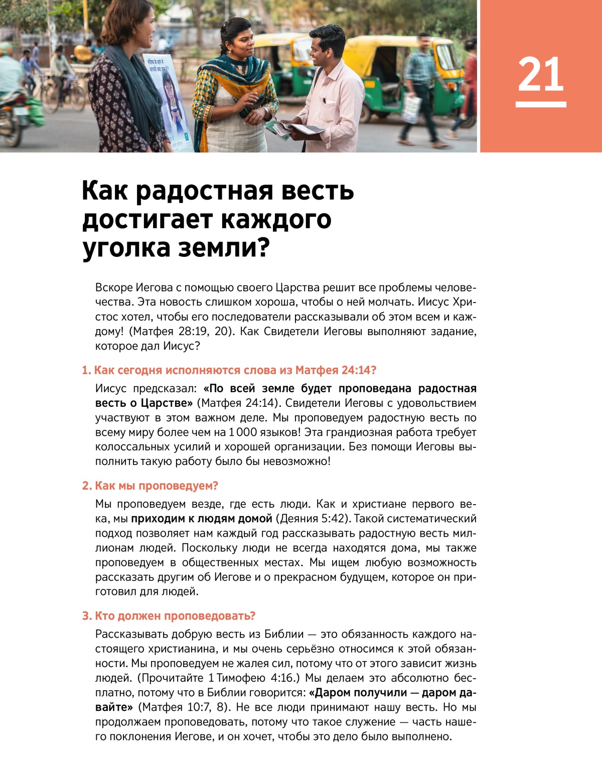 Вскоре Иегова с помощью своего Царства решит все проблемы человечества. Эта новость слишком хороша, чтобы о ней молчать. Иисус Христос хотел, чтобы его последователи рассказывали об этом всем и каждому! (Матфея 28:19, 20). Как Свидетели Иеговы выполняют задание, которое дал Иисус?