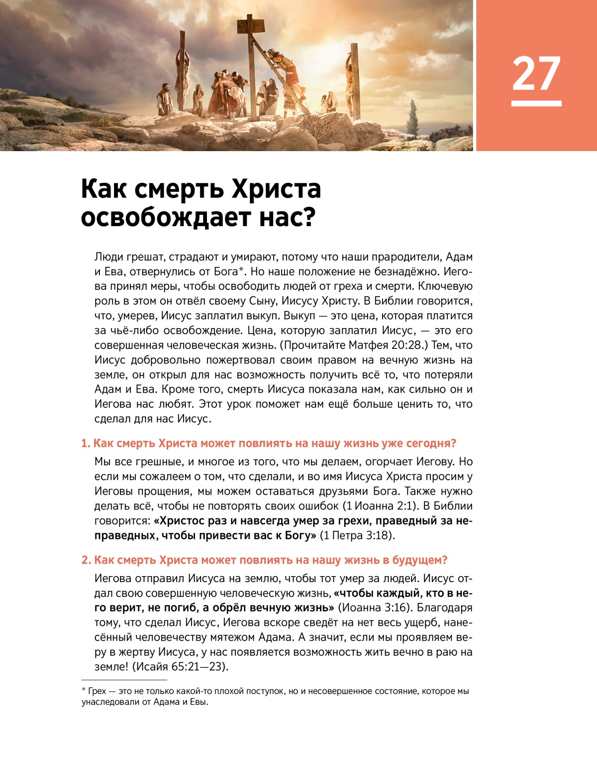 Люди грешат, страдают и умирают, потому что наши прародители, Адам и Ева, отвернулись от Богаa. Но наше положение не безнадёжно. Иегова принял меры, чтобы освободить людей от греха и смерти. Ключевую роль в этом он отвёл своему Сыну, Иисусу Христу. В Библии говорится, что, умерев, Иисус заплатил выкуп. Выкуп — это цена, которая платится за чьё-либо освобождение. Цена, которую заплатил Иисус, — это его совершенная человеческая жизнь. (Прочитайте Матфея 20:28.) Тем, что Иисус добровольно пожертвовал своим правом на вечную жизнь на земле, он открыл для нас возможность получить всё то, что потеряли Адам и Ева. Кроме того, смерть Иисуса показала нам, как сильно он и Иегова нас любят. Этот урок поможет нам ещё больше ценить то, что сделал для нас Иисус.