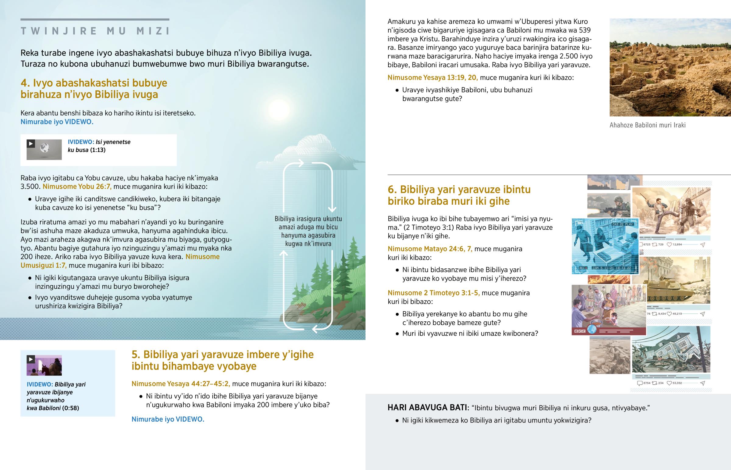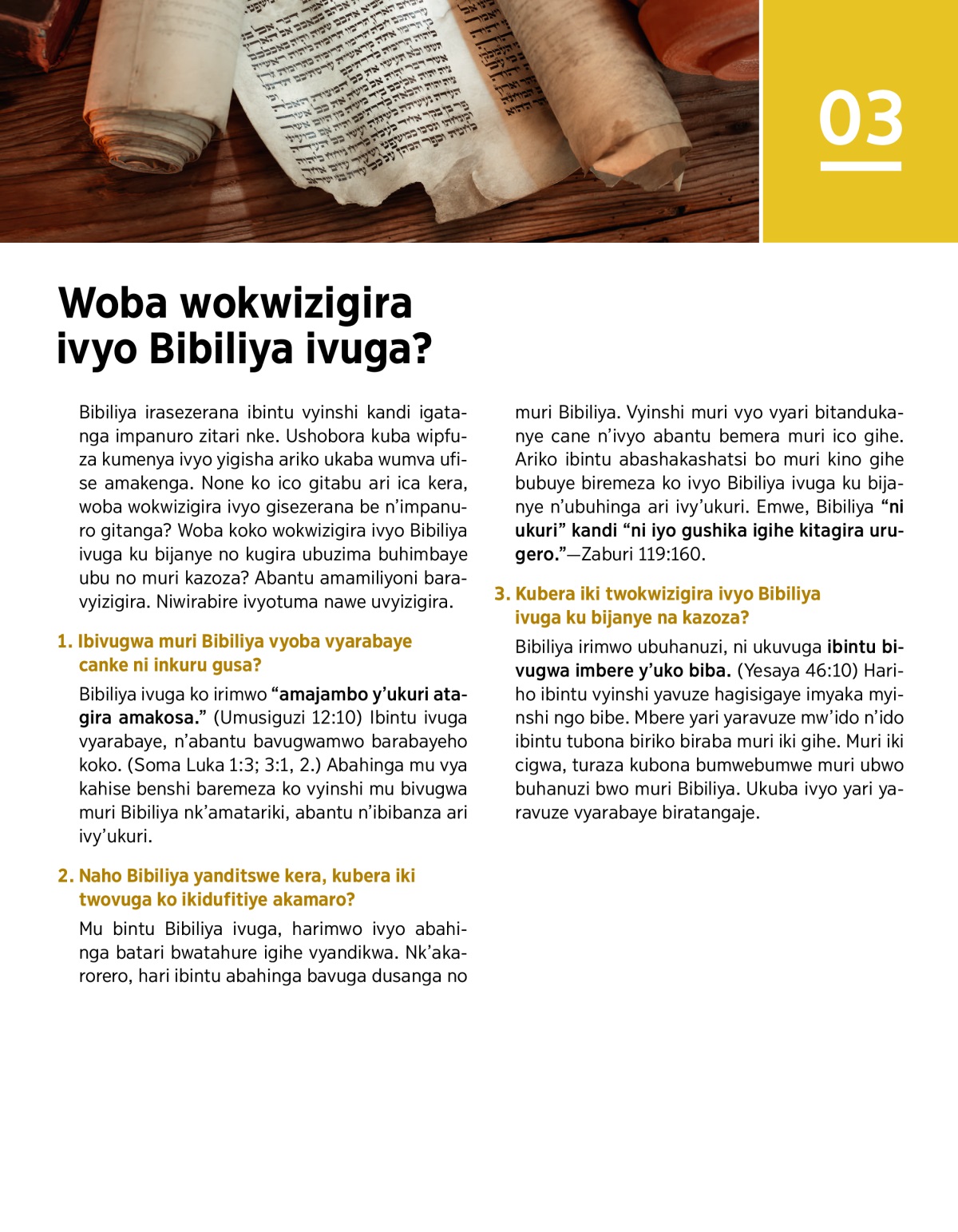 Bibiliya irimwo ubuhanuzi, ni ukuvuga ibintu bivugwa imbere y’uko biba. (Yesaya 46:10) Hariho ibintu vyinshi yavuze hagisigaye imyaka myinshi ngo bibe. Mbere yari yaravuze mw’ido n’ido ibintu tubona biriko biraba muri iki gihe. Muri iki cigwa, turaza kubona bumwebumwe muri ubwo buhanuzi bwo muri Bibiliya. Ukuba ivyo yari yaravuze vyarabaye biratangaje.