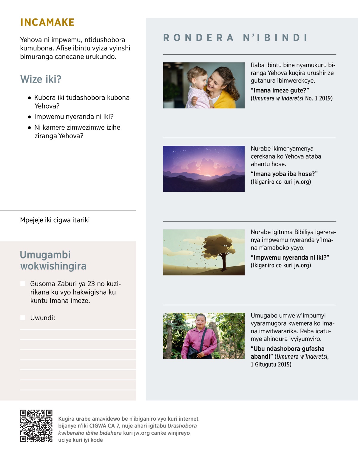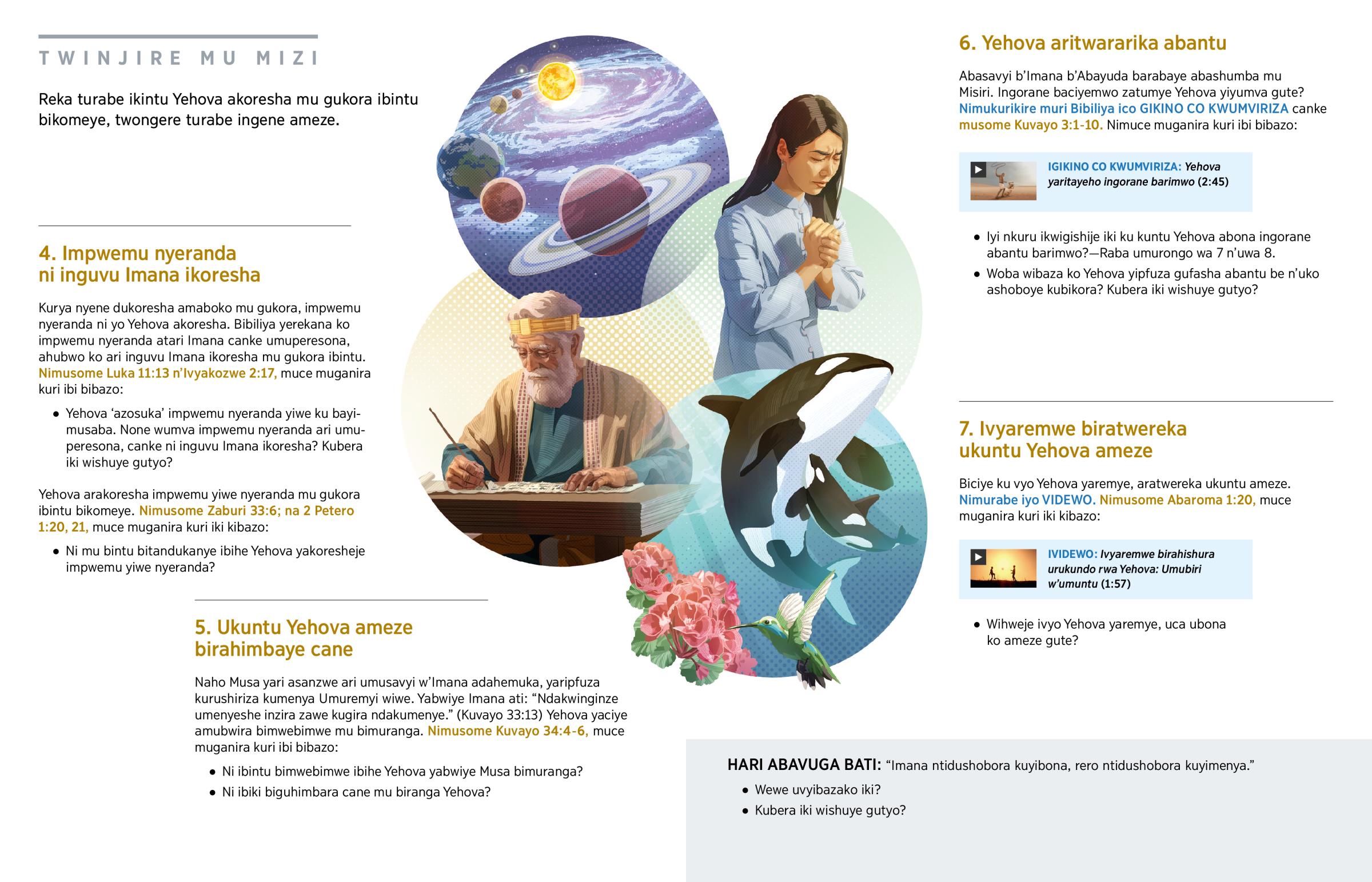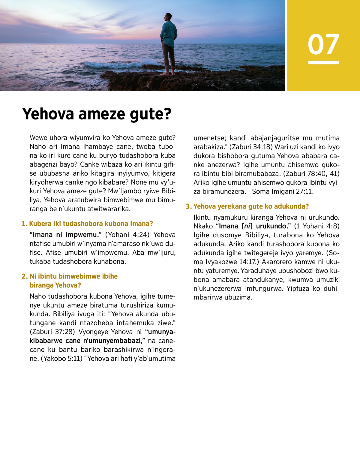 Wewe uhora wiyumvira ko Yehova ameze gute? Naho ari Imana ihambaye cane, twoba tubona ko iri kure cane ku buryo tudashobora kuba abagenzi bayo? Canke wibaza ko ari ikintu gifise ububasha ariko kitagira inyiyumvo, kitigera kiryoherwa canke ngo kibabare? None mu vy’ukuri Yehova ameze gute? Mw’Ijambo ryiwe Bibiliya, Yehova aratubwira bimwebimwe mu bimuranga be n’ukuntu atwitwararika.