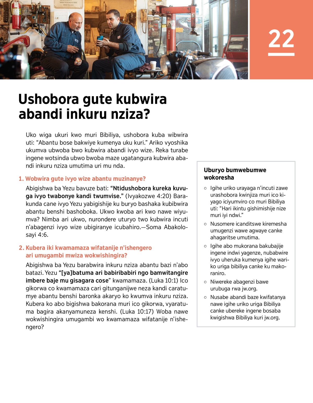 Icigwa ca 22. Uwiga Bibiliya ariko abwira inkuru nziza uwo bakorana aho bakorera ivyuma mu mwanya w’akaruhuko.