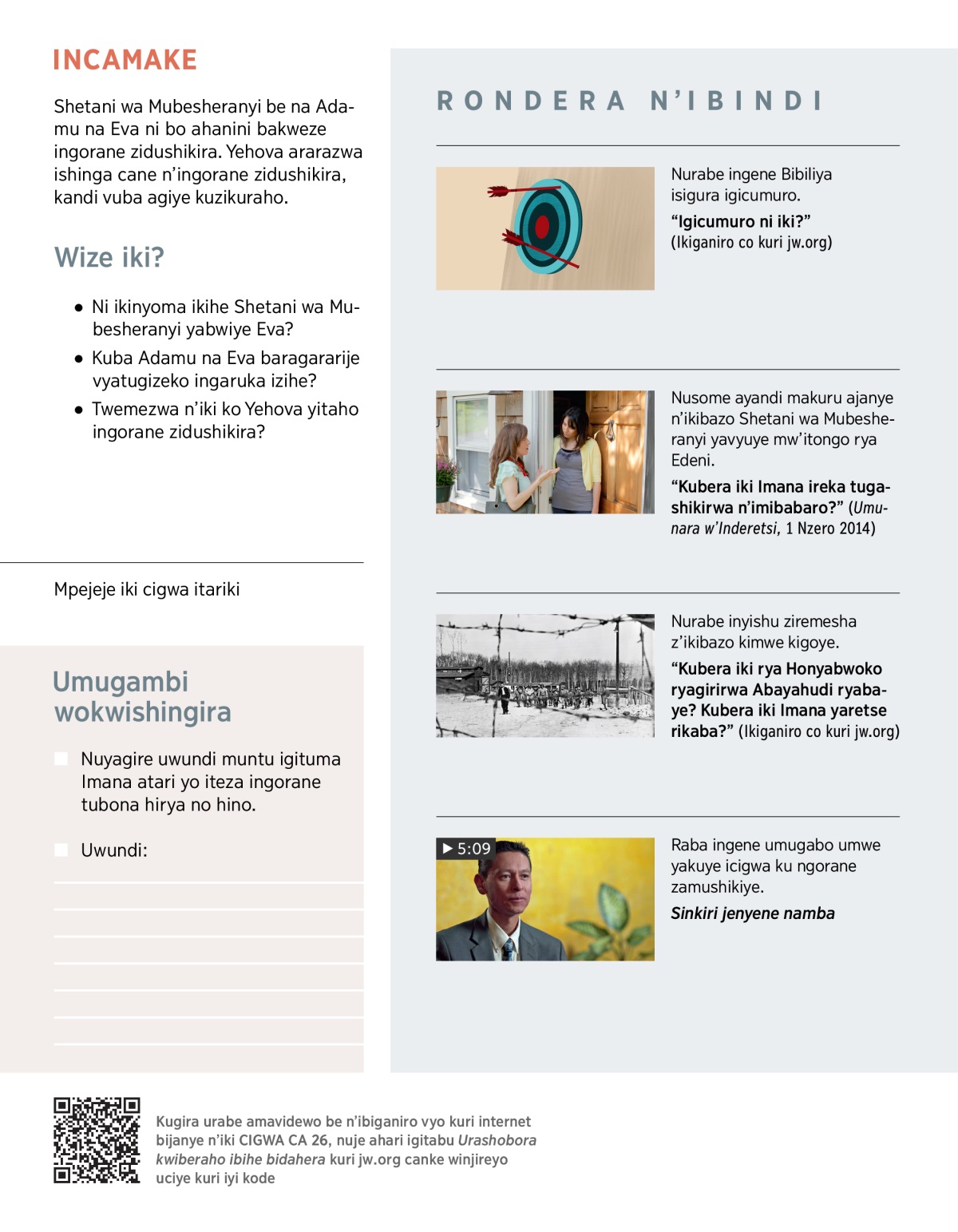 Igihe dushikiwe n’ingorane, ni ibisanzwe ko twibaza duti: “Kubera iki vyashitse?” Biraduhimbara kuba Bibiliya itanga inyishu y’ico kibazo.