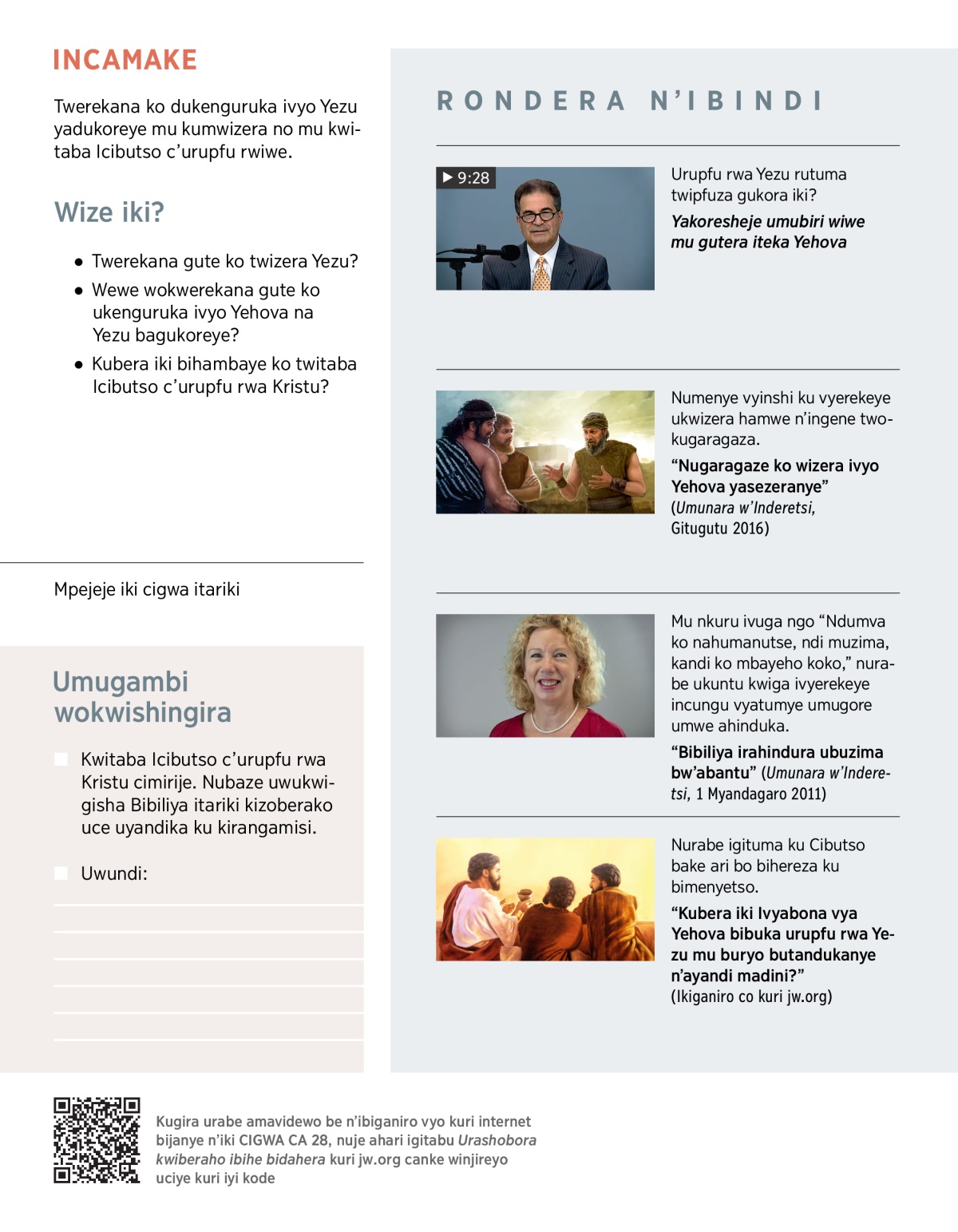 Yezu yashaka ko abigishwa biwe bahimbaza Icibutso c’urupfu rwiwe rimwe mu mwaka. Ku bw’ivyo, Ivyabona vya Yehova barahurira hamwe buri mwaka kugira bibuke urupfu rwa Kristu nk’uko yabitegetse. Kugira umenye vyinshi ku vyerekeye ico Cibutso, nimurabe iyo VIDEWO, muce muganira kuri iki kibazo: