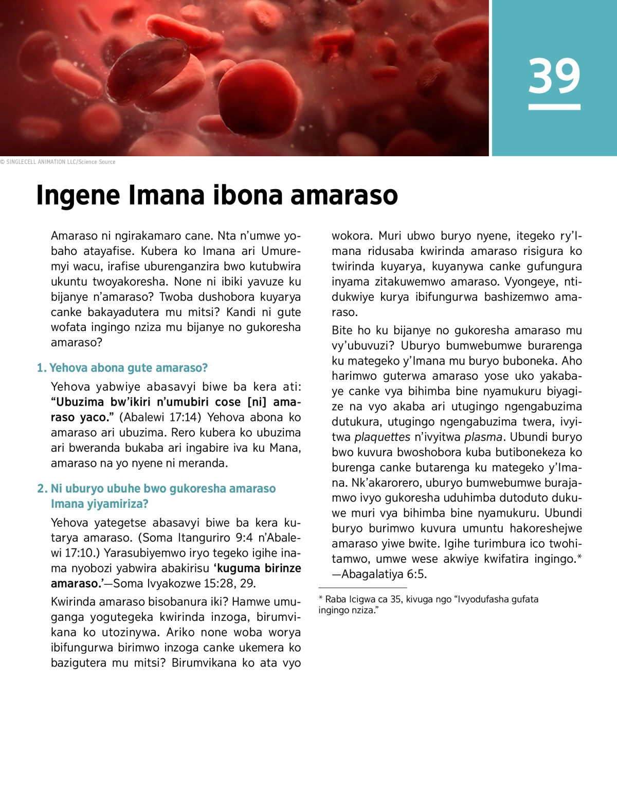 Amaraso ni ngirakamaro cane. Nta n’umwe yobaho atayafise. Kubera ko Imana ari Umuremyi wacu, irafise uburenganzira bwo kutubwira ukuntu twoyakoresha. None ni ibiki yavuze ku bijanye n’amaraso? Twoba dushobora kuyarya canke bakayadutera mu mitsi? Kandi ni gute wofata ingingo nziza mu bijanye no gukoresha amaraso?