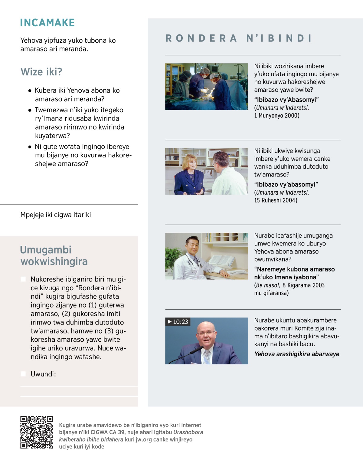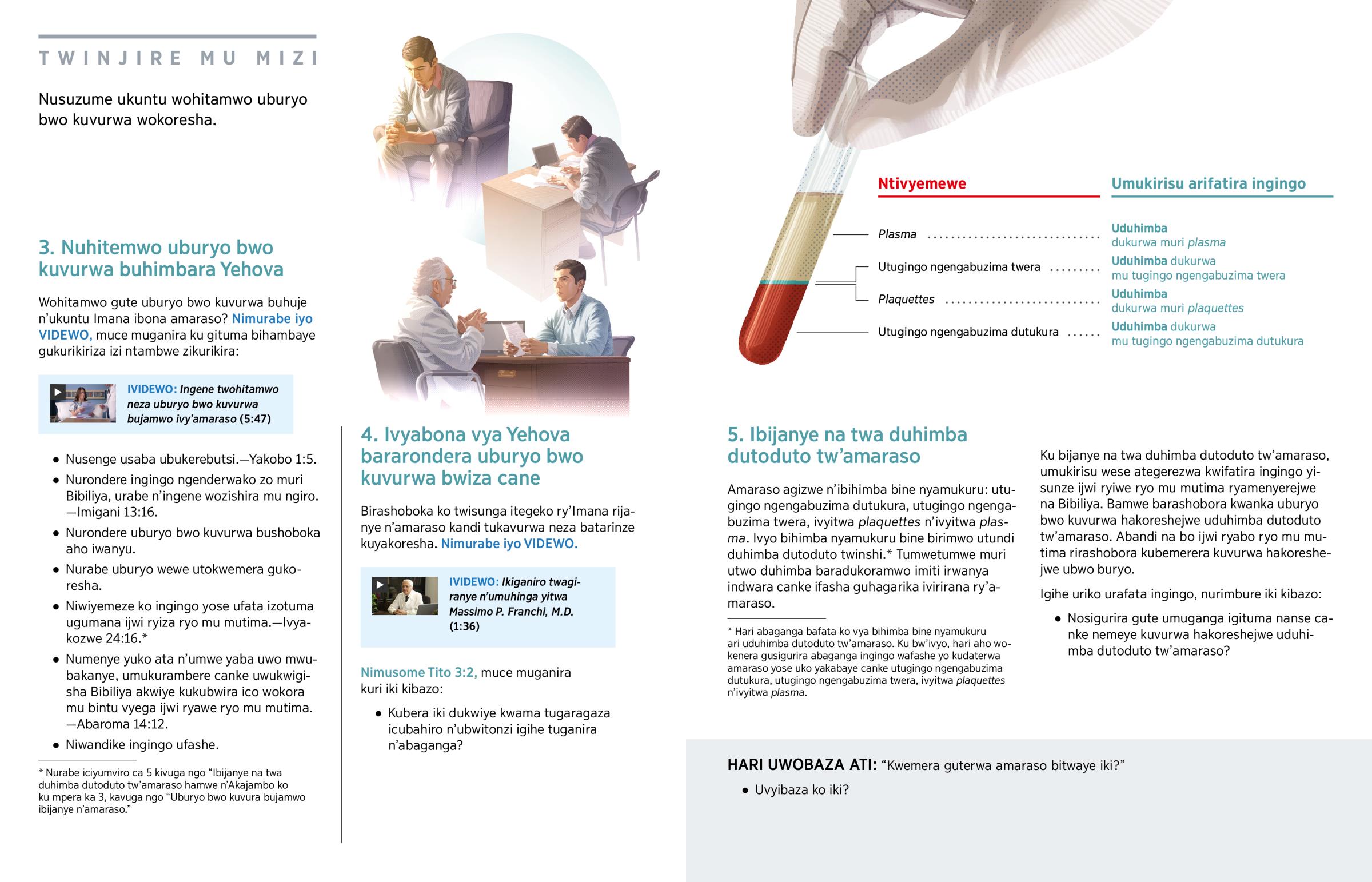 Bite ho ku bijanye no gukoresha amaraso mu vy’ubuvuzi? Uburyo bumwebumwe burarenga ku mategeko y’Imana mu buryo buboneka. Aho harimwo guterwa amaraso yose uko yakabaye canke vya bihimba bine nyamukuru biyagize na vyo akaba ari utugingo ngengabuzima dutukura, utugingo ngengabuzima twera, ivyitwa plaquettes n’ivyitwa plasma. Ubundi buryo bwo kuvura bwoshobora kuba butibonekeza ko burenga canke butarenga ku mategeko y’Imana. Nk’akarorero, uburyo bumwebumwe burajamwo ivyo gukoresha uduhimba dutoduto dukuwe muri vya bihimba bine nyamukuru. Ubundi buryo burimwo kuvura umuntu hakoreshejwe amaraso yiwe bwite. Igihe turimbura ico twohitamwo, umwe wese akwiye kwifatira ingingo.a—Abagalatiya 6:5.