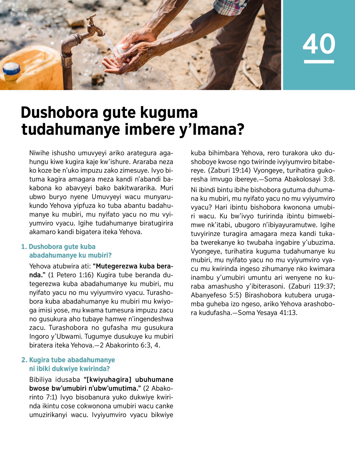Yehova atubwira ati: “Mutegerezwa kuba beranda.” (1 Petero 1:16) Kugira tube beranda dutegerezwa kuba abadahumanye ku mubiri, mu nyifato yacu no mu vyiyumviro vyacu. Turashobora kuba abadahumanye ku mubiri mu kwiyoga imisi yose, mu kwama tumesura impuzu zacu no gusukura aho tubaye hamwe n’ingendeshwa zacu. Turashobora no gufasha mu gusukura Ingoro y’Ubwami. Tugumye dusukuye ku mubiri biratera iteka Yehova.—2 Abakorinto 6:3, 4.