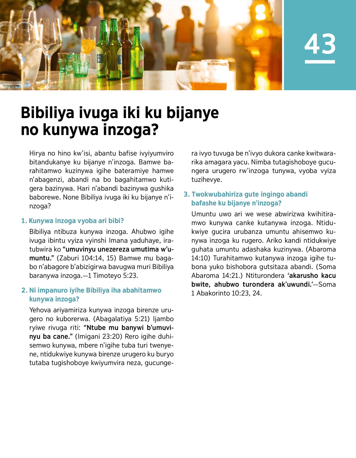Niwahitamwo kunywa inzoga, niwibuke iki kintu: Naho Yehova atabuza kunywa inzoga, ariyamiriza kunywa birenze urugero. Uti kubera iki? Nimusome Hoseya 4:11, 18, muce muganira kuri iki kibazo: