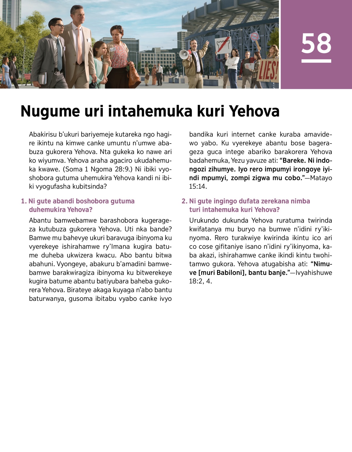 Abantu bamwebamwe barashobora kugerageza kutubuza gukorera Yehova. Uti nka bande? Bamwe mu bahevye ukuri baravuga ibinyoma ku vyerekeye ishirahamwe ry’Imana kugira batume duheba ukwizera kwacu. Abo bantu bitwa abahuni. Vyongeye, abakuru b’amadini bamwebamwe barakwiragiza ibinyoma ku bitwerekeye kugira batume abantu batiyubara baheba gukorera Yehova. Birateye akaga kuyaga n’abo bantu baturwanya, gusoma ibitabu vyabo canke ivyo bandika kuri internet canke kuraba amavidewo yabo. Ku vyerekeye abantu bose bagerageza guca intege abariko barakorera Yehova badahemuka, Yezu yavuze ati: “Bareke. Ni indongozi zihumye. Iyo rero impumyi irongoye iyindi mpumyi, zompi zigwa mu cobo.”—Matayo 15:14.