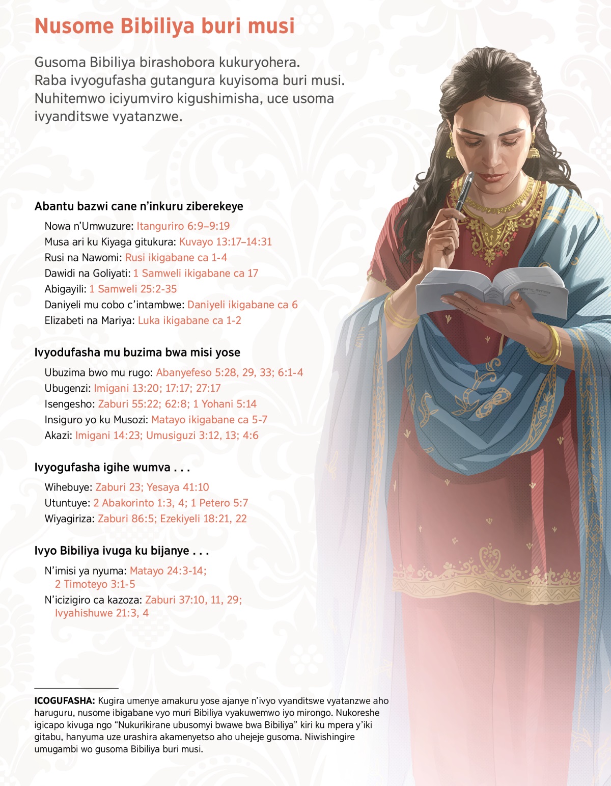 ICOGUFASHA: Kugira umenye amakuru yose ajanye n’ivyo vyanditswe vyatanzwe aho haruguru, nusome ibigabane vyo muri Bibiliya vyakuwemwo iyo mirongo. Nukoreshe igicapo kivuga ngo “Nukurikirane ubusomyi bwawe bwa Bibiliya” kiri ku mpera y’iki gitabu, hanyuma uze urashira akamenyetso aho uhejeje gusoma. Niwishingire umugambi wo gusoma Bibiliya buri musi.