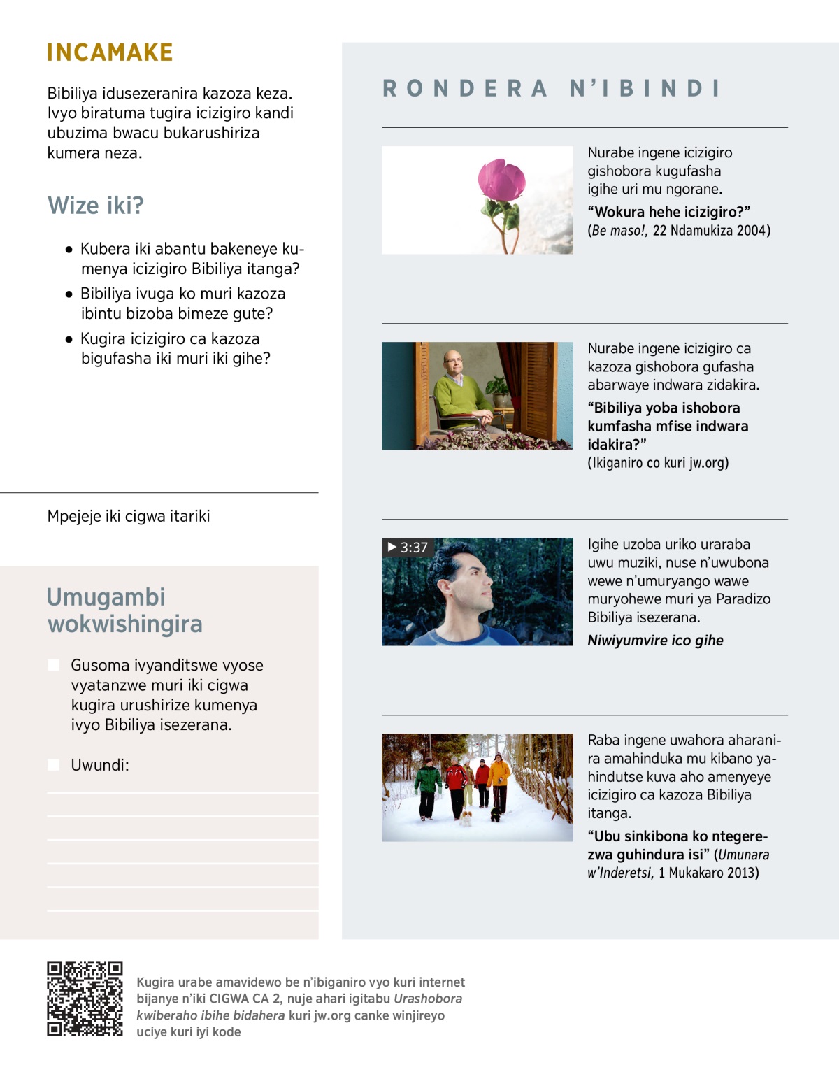 Bibiliya irasigura igituma iyi si yuzuye ingorane. Ariko kandi iratubwira agakuru keza. Ivuga ko zigiye kurangira. Ibintu Bibiliya isezerana ku bijanye na kazoza birashobora gutuma ugira icizigiro. (Soma Yeremiya 29:11, 12.) Vyongeye, biradufasha kwihanganira ingorane zidushikira muri iki gihe, bigatuma tubona ibintu mu buryo bwiza kandi tukagumana umunezero.