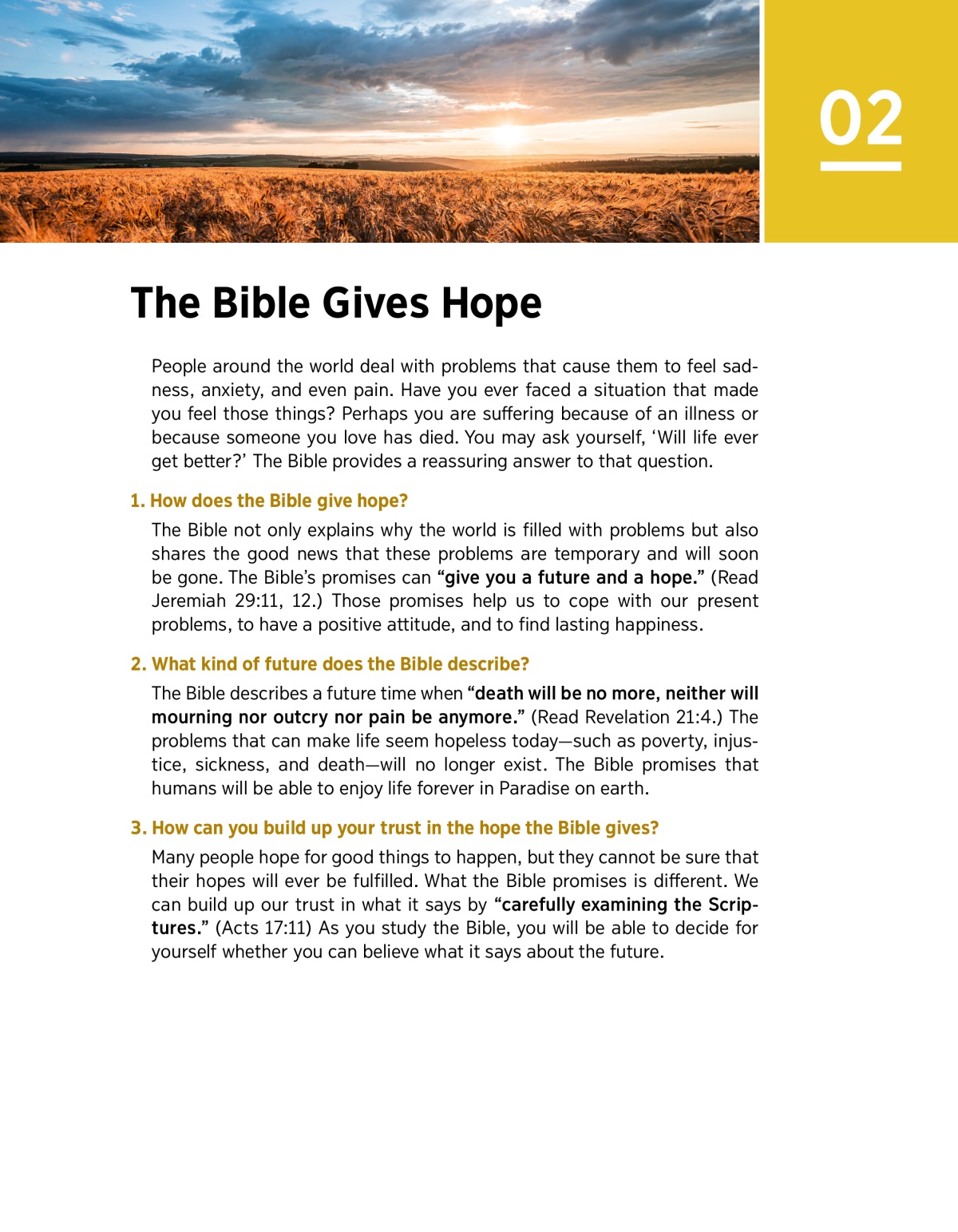 Examine some of the conditions that the Bible promises for the future. See how the hope the Bible gives is helping people today.