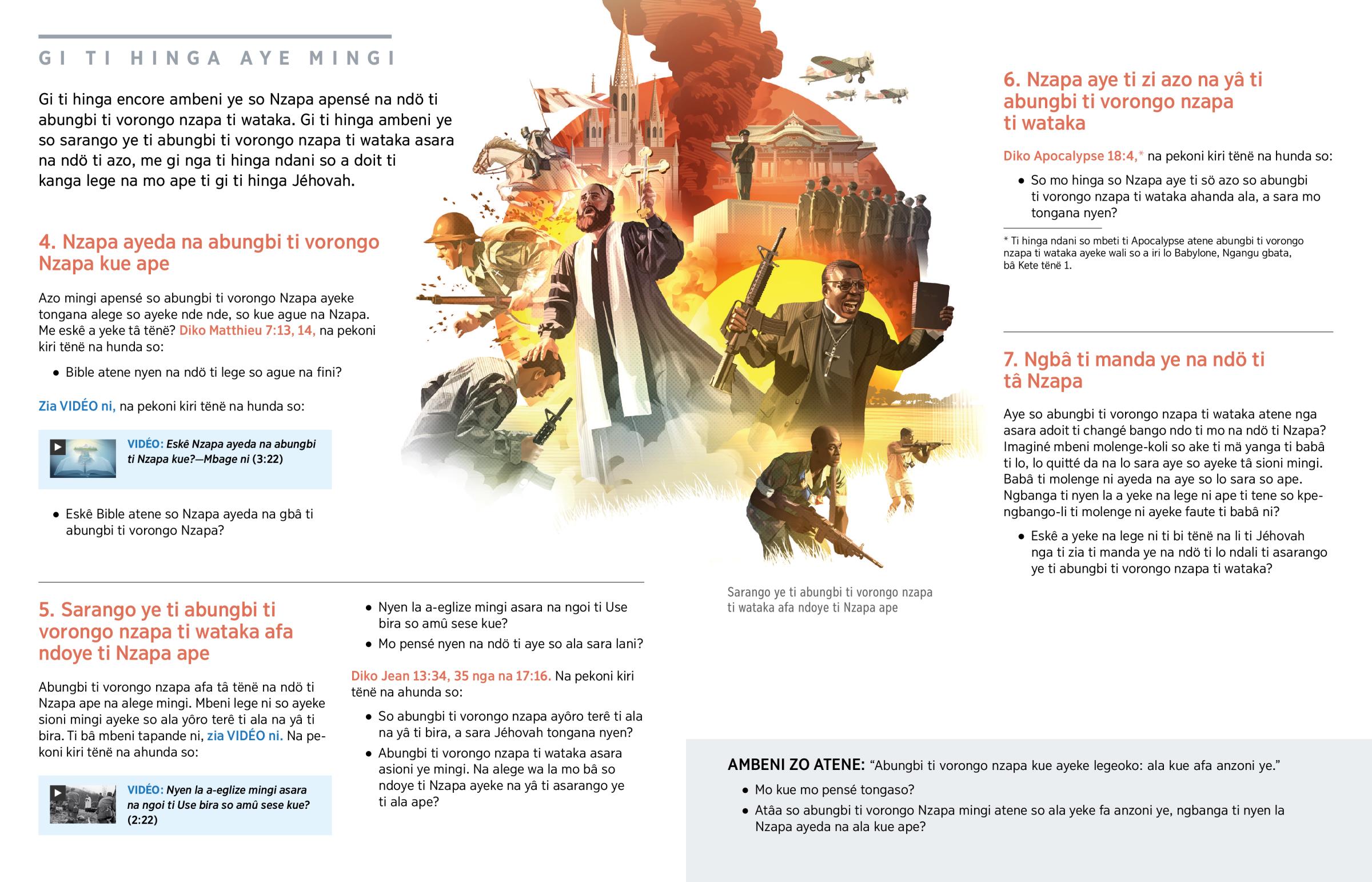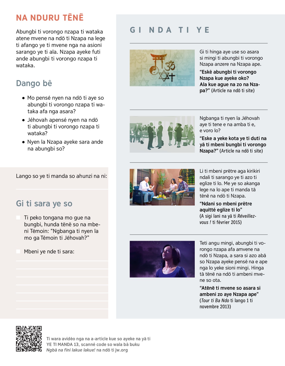 Gi ti hinga encore ambeni ye so Nzapa apensé na ndö ti abungbi ti vorongo nzapa ti wataka. Gi ti hinga ambeni ye so sarango ye ti abungbi ti vorongo nzapa ti wataka asara na ndö ti azo, me gi nga ti hinga ndani so a doit ti kanga lege na mo ape ti gi ti hinga Jéhovah.