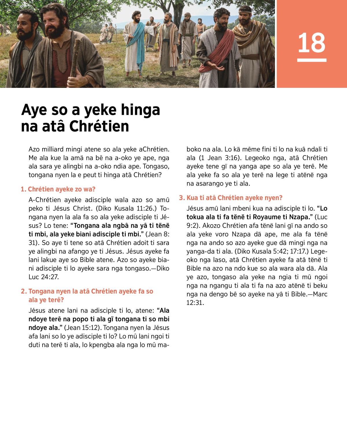 A-Chrétien ayeke adisciple wala azo so amû peko ti Jésus Christ. (Diko Kusala 11:26.) Tongana nyen la ala fa so ala yeke adisciple ti Jésus? Lo tene: “Tongana ala ngbâ na yâ ti tënë ti mbi, ala yeke biani adisciple ti mbi.” (Jean 8:31). So aye ti tene so atâ Chrétien adoit ti sara ye alingbi na afango ye ti Jésus. Jésus ayeke fa lani lakue aye so Bible atene. Azo so ayeke biani adisciple ti lo ayeke sara nga tongaso.—Diko Luc 24:27.