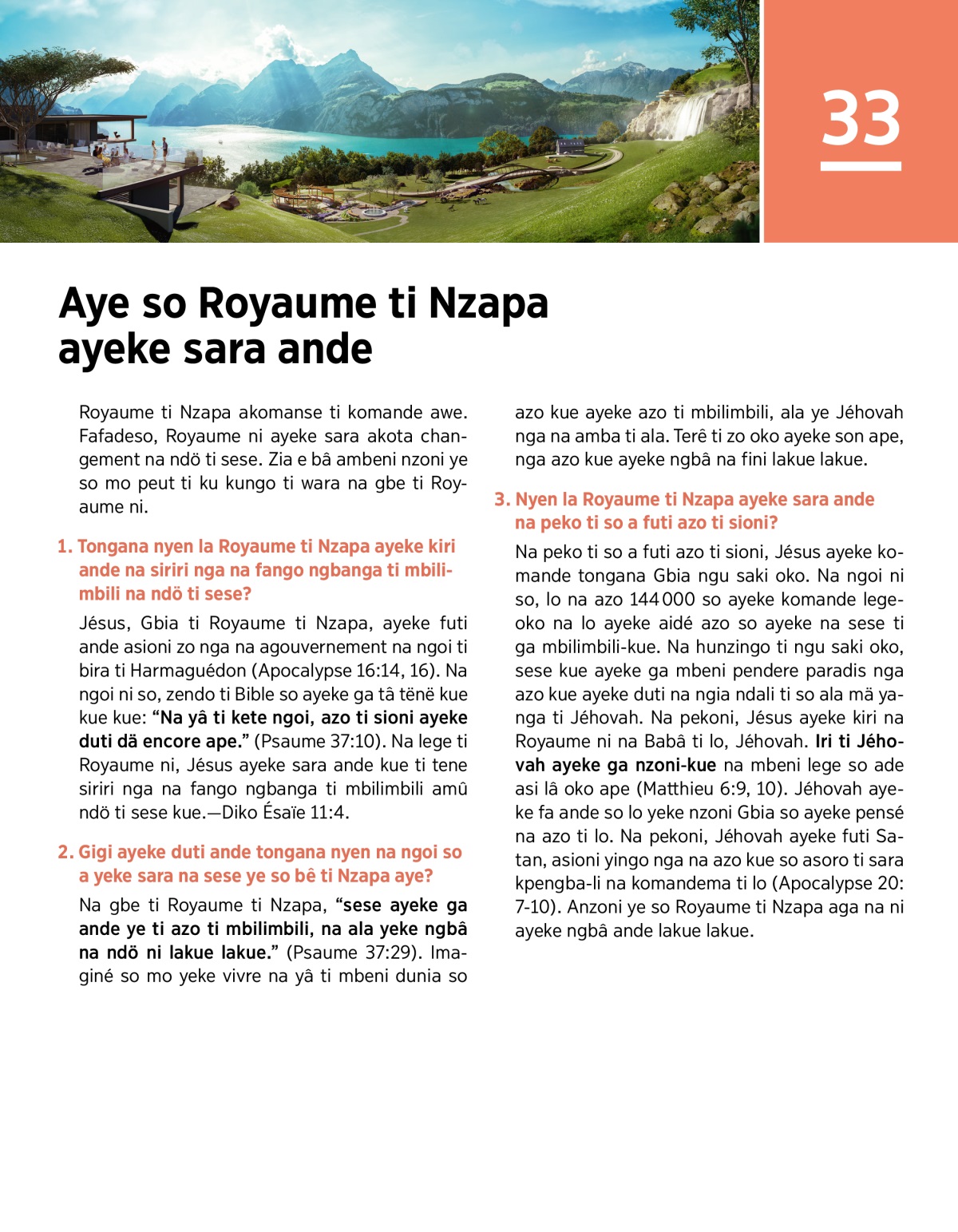 Royaume ti Nzapa ayeke sara ye so Nzapa aye ti tene a sara. A yeke sara ande si sese kue aga mbeni paradis so asi singo na anzoni zo so ayeke voro Jéhovah lakue lakue.