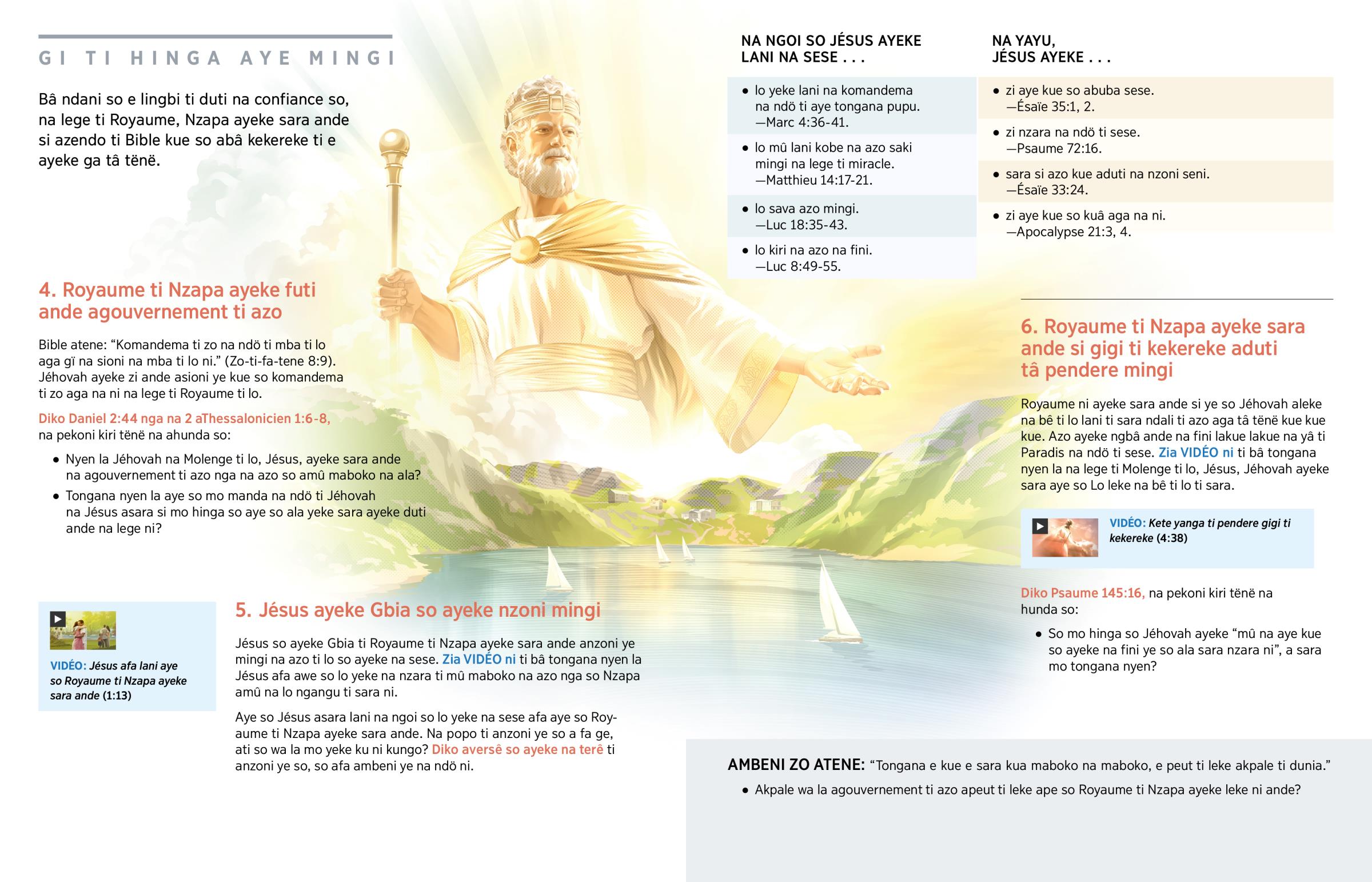 Royaume ni ayeke sara ande si ye so Jéhovah aleke na bê ti lo lani ti sara ndali ti azo aga tâ tënë kue kue kue. Azo ayeke ngbâ ande na fini lakue lakue na yâ ti Paradis na ndö ti sese. Zia VIDÉO ni ti bâ tongana nyen la na lege ti Molenge ti lo, Jésus, Jéhovah ayeke sara aye so Lo leke na bê ti lo ti sara.