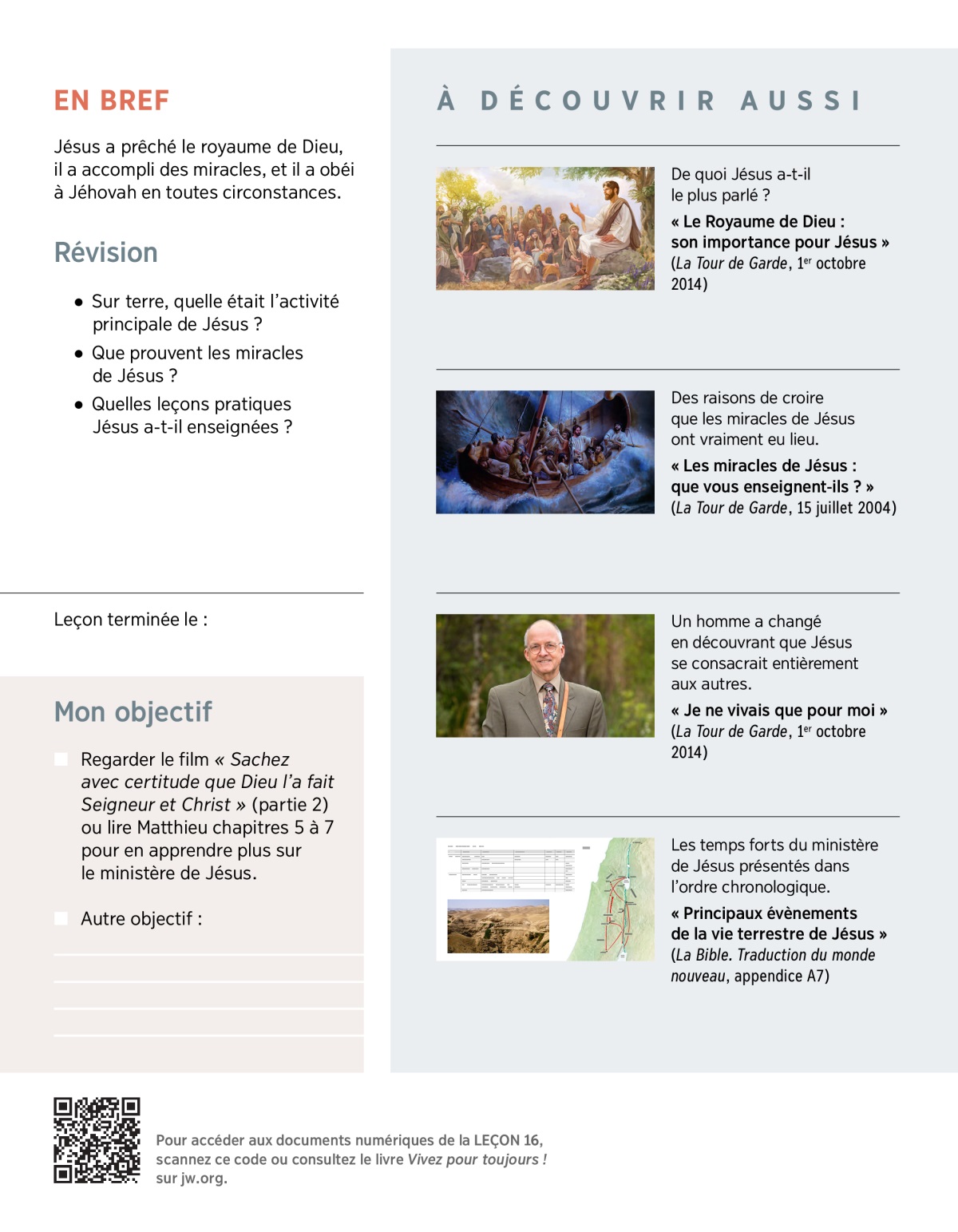 Les temps forts du ministère de Jésus présentés dans l’ordre chronologique.
