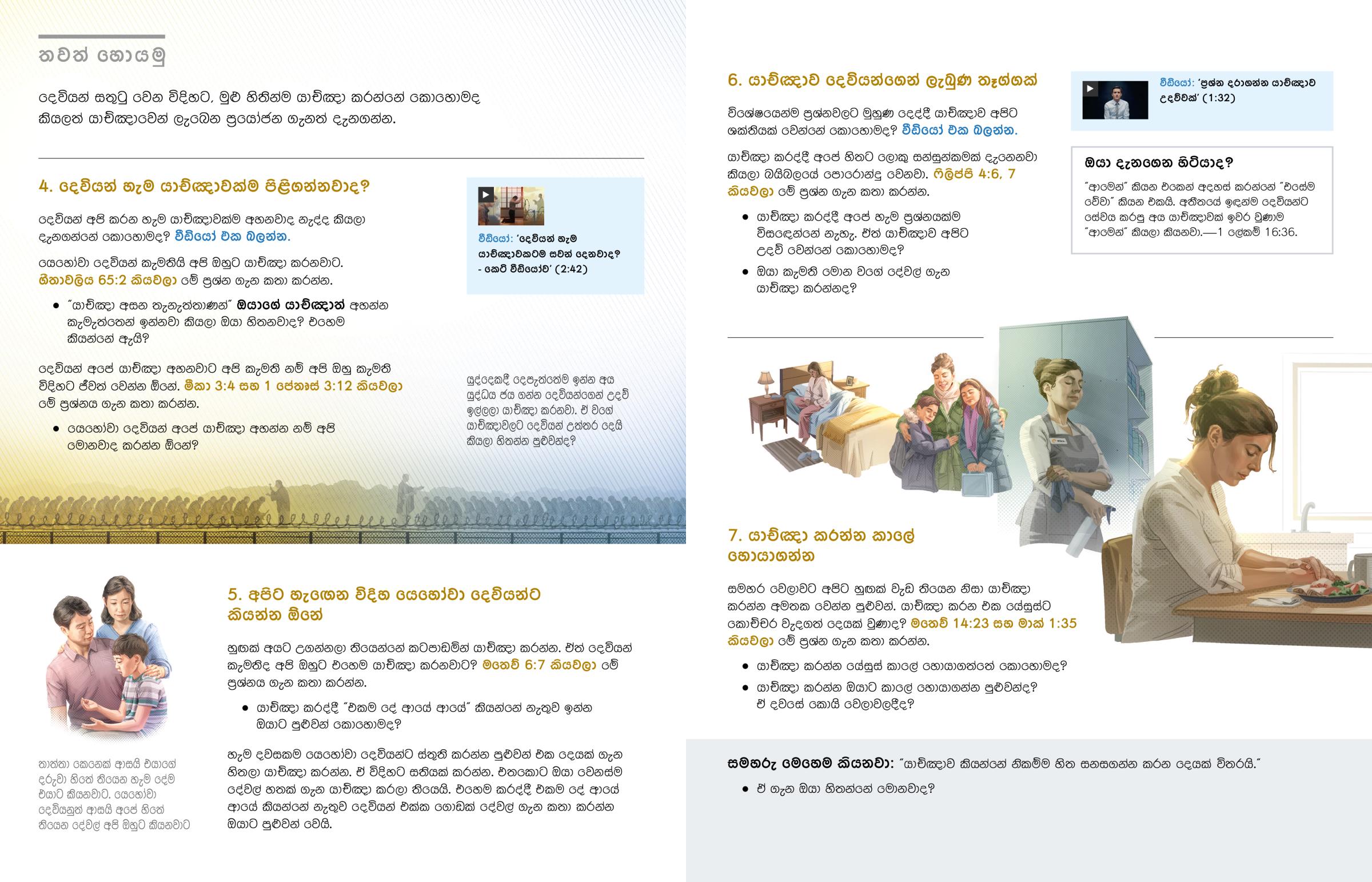 ඔයාගේ ජීවිතේට හරි මඟ පෙන්වීම් ඕනෙ කියලා ඔයාට හිතෙනවාද? හිතට වධ දෙන ප්රශ්නවලට ඔයා උත්තර හොයනවාද? ඔයාට සහනයක් ඕනෙ කියලා දැනිලා තියෙනවාද? යෙහෝවා දෙවියන්ට තව ළං වුණොත් හොඳයි කියලා ඔයාට හිතෙනවාද? යාච්ඤාව ඒ හැම දේටම උදව් වෙනවා. ඒත් යාච්ඤා කරන්න ඕනෙ කොහොමද? දෙවියන් හැම යාච්ඤාවක්ම අහනවාද? දෙවියන් ඔයාගේ යාච්ඤා අහන්න නම් ඔයා මොනවාද කරන්න ඕනේ?