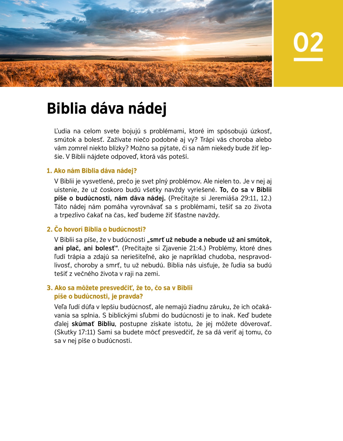 Biblia nám dáva nádej, že v budúcnosti budú ľudia žiť šťastne a v ideálnych podmienkach. To nám pomáha vyrovnávať sa so súčasnými problémami.