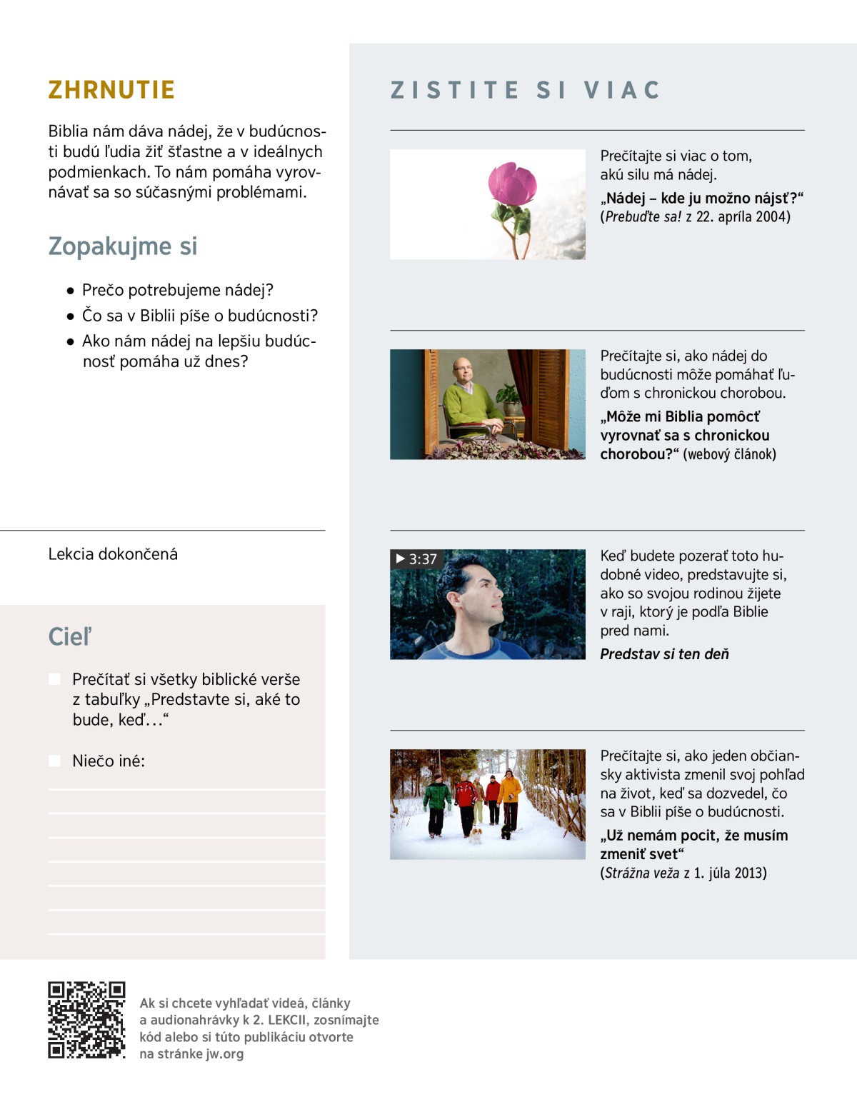 To, čo sa dozvedáme z Biblie, nám pomáha, aby sme nestrácali nádej a dokázali zvládať dnešné problémy. Prečítajte si Príslovia 17:22 a Rimanom 12:12 a porozprávajte sa o týchto otázkach: