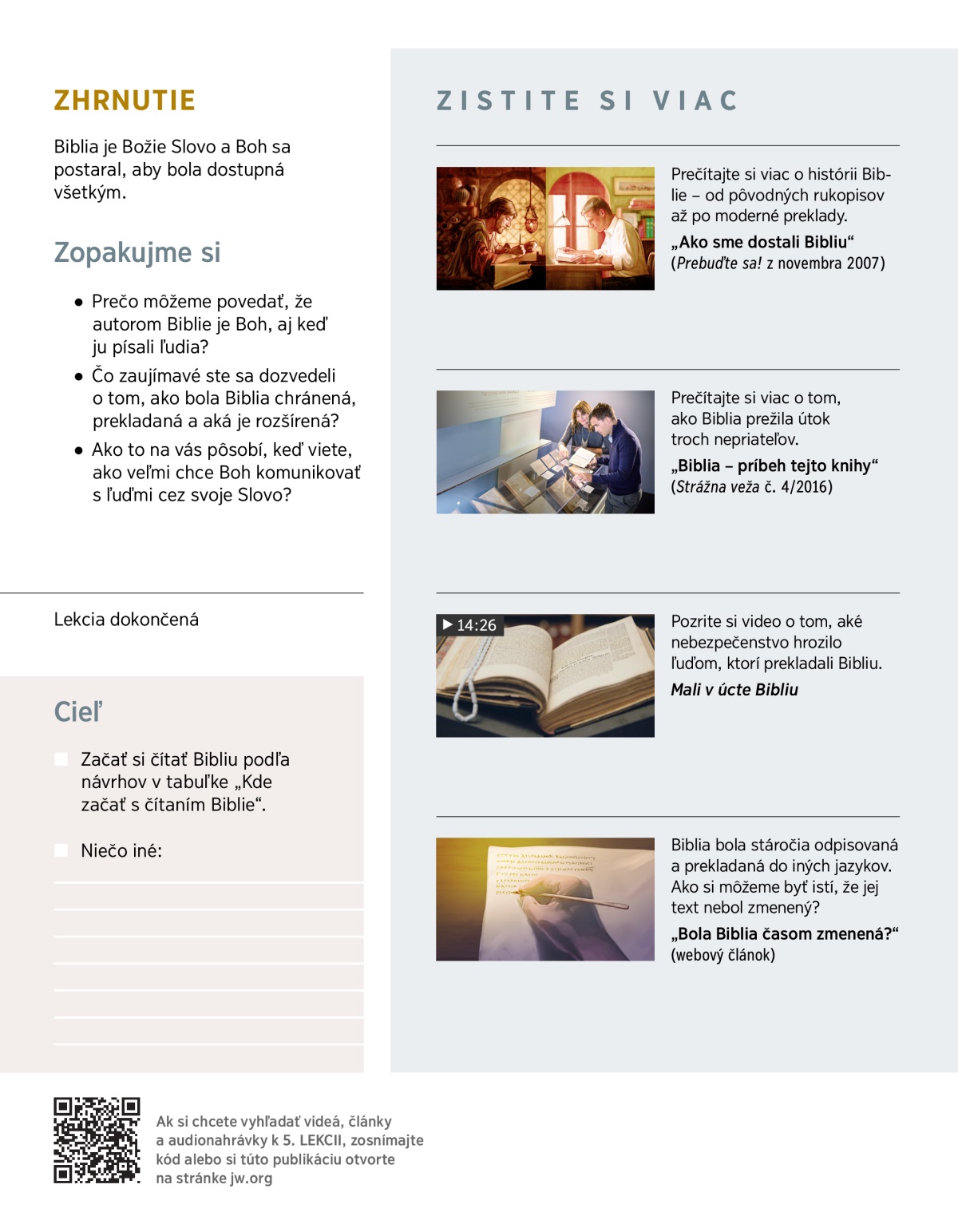 V priebehu histórie sa veľa vplyvných ľudí snažilo Bibliu zničiť. Náboženskí vodcovia ľuďom bránili, aby ju čítali. No keďže Biblia pochádza od Boha, on nedovolil, aby sa tieto snahy podarili. Mnohí ľudia riskovali život a znášali odpor a prenasledovanie, aby sa Biblia zachovala a dostala sa k ľuďom. Pozrite si VIDEO a porozprávajte sa o nasledujúcich otázkach.