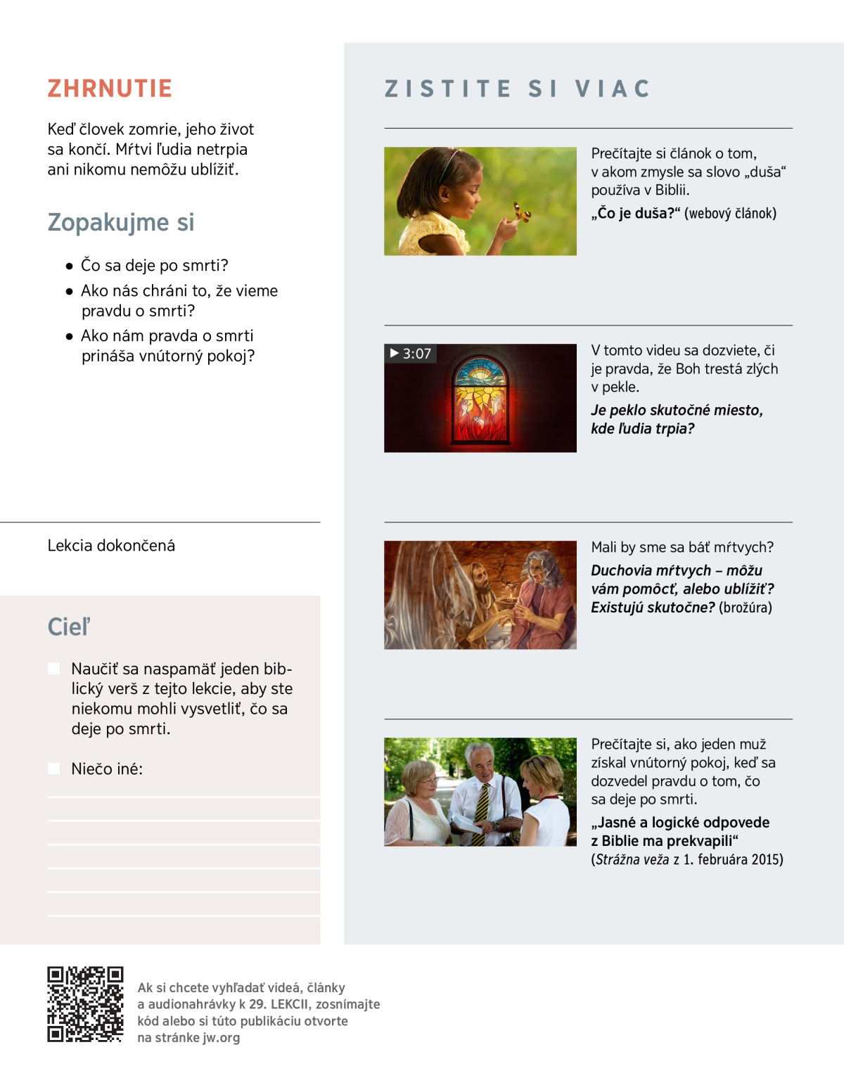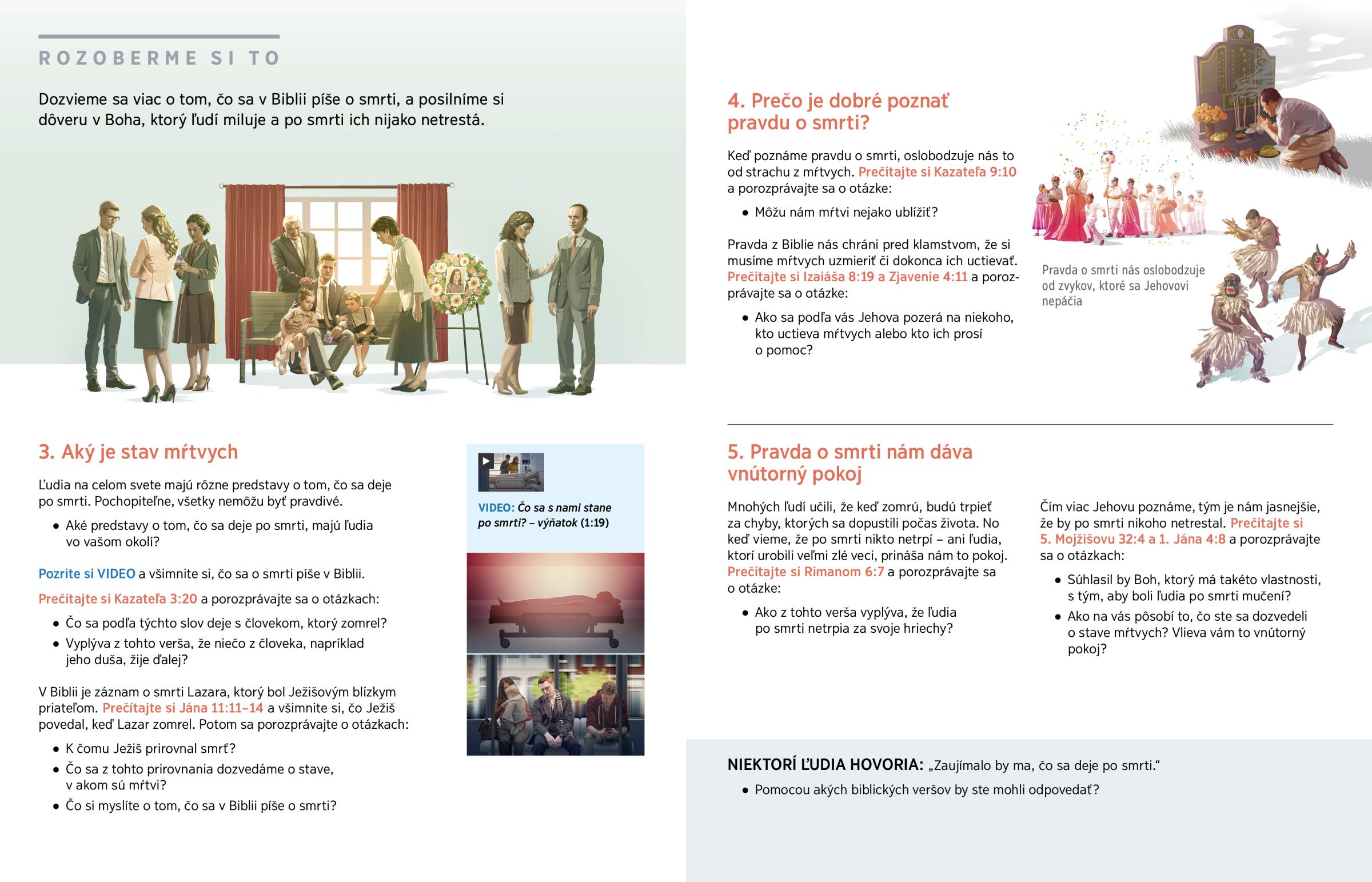 Zomrel vám už niekto, s kým ste mali blízky vzťah? Potom určite viete, aké je to bolestivé. V takých chvíľach viac rozmýšľame nad tým, čo sa deje po smrti a či sa ešte stretneme s blízkymi, ktorých sme stratili. V Biblii nájdeme odpovede, ktoré nás veľmi potešia. V tejto a nasledujúcej lekcii si ich rozoberieme.