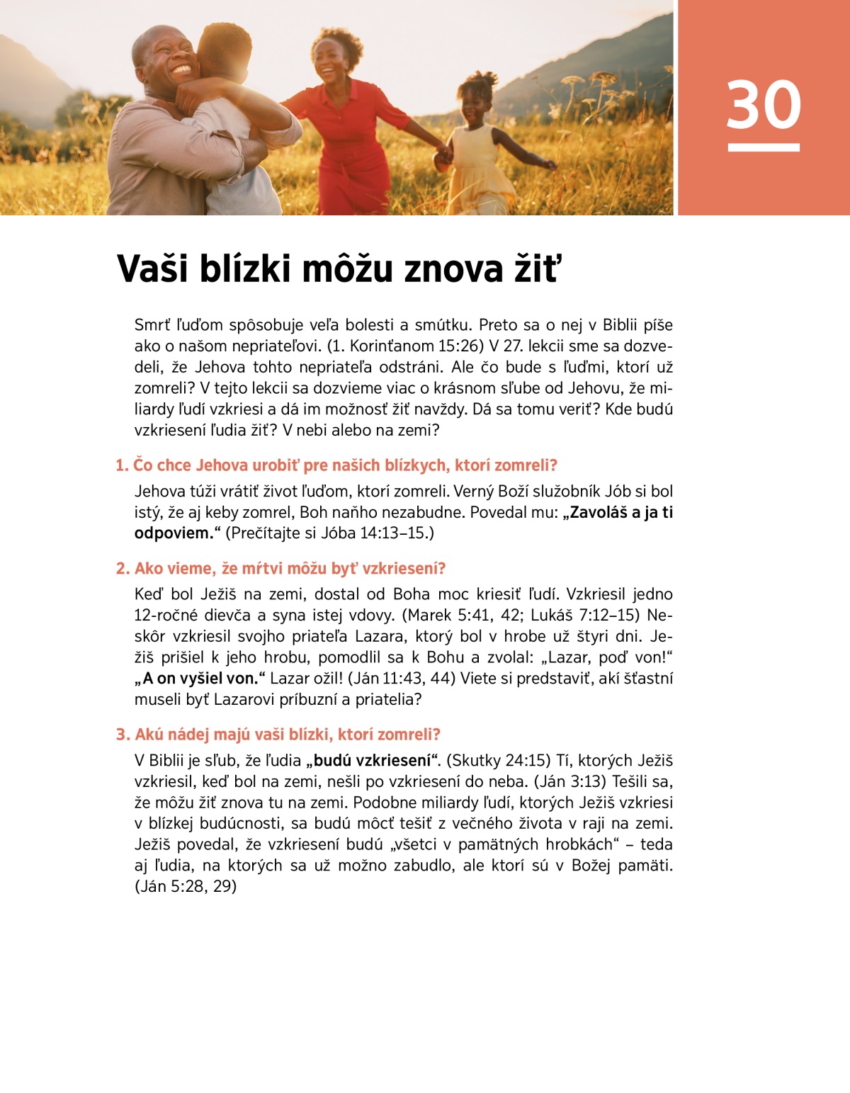 Smrť ľuďom spôsobuje veľa bolesti a smútku. Preto sa o nej v Biblii píše ako o našom nepriateľovi. (1. Korinťanom 15:26) V 27. lekcii sme sa dozvedeli, že Jehova tohto nepriateľa odstráni. Ale čo bude s ľuďmi, ktorí už zomreli? V tejto lekcii sa dozvieme viac o krásnom sľube od Jehovu, že miliardy ľudí vzkriesi a dá im možnosť žiť navždy. Dá sa tomu veriť? Kde budú vzkriesení ľudia žiť? V nebi alebo na zemi?