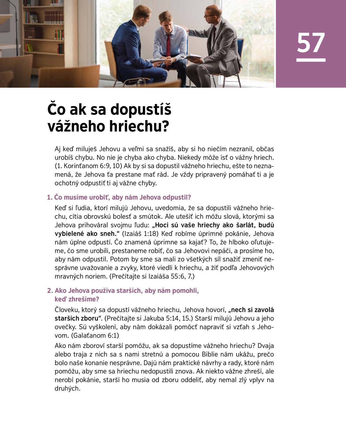 Ako nám zboroví starší pomôžu, ak sa dopustíme vážneho hriechu? Dvaja alebo traja z nich sa s nami stretnú a pomocou Biblie nám ukážu, prečo bolo naše konanie nesprávne. Dajú nám praktické návrhy a rady, ktoré nám pomôžu, aby sme sa hriechu nedopustili znova. Ak niekto vážne zhreší, ale nerobí pokánie, starší ho musia od zboru oddeliť, aby nemal zlý vplyv na druhých.
