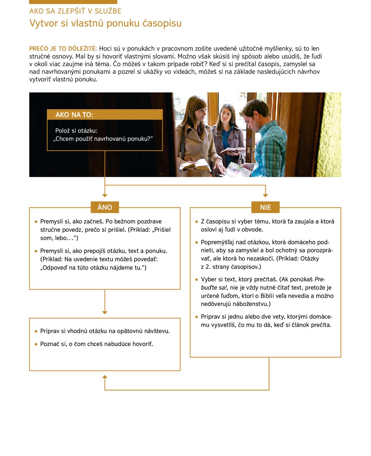 PREČO JE TO DÔLEŽITÉ: Hoci sú v ponukách v pracovnom zošite uvedené užitočné myšlienky, sú to len stručné osnovy. Mal by si hovoriť vlastnými slovami. Možno však skúsiš iný spôsob alebo usúdiš, že ľudí v okolí viac zaujme iná téma. Čo môžeš v takom prípade robiť? Keď si si prečítal časopis, zamyslel sa nad navrhovanými ponukami a pozrel si ukážky vo videách, môžeš si na základe nasledujúcich návrhov vytvoriť vlastnú ponuku.