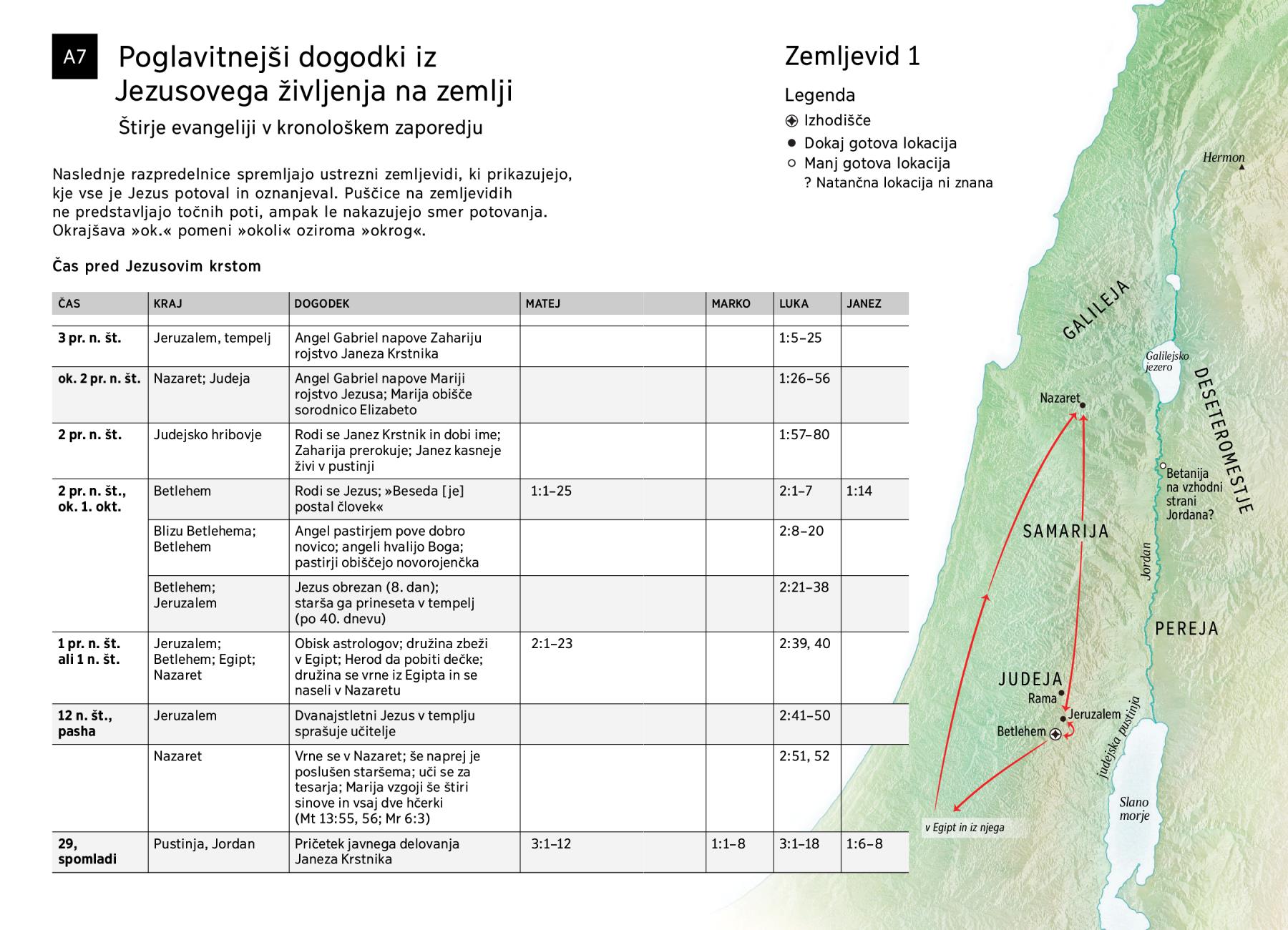 Naslednje razpredelnice spremljajo ustrezni zemljevidi, ki prikazujejo, kje vse je Jezus potoval in oznanjeval. Puščice na zemljevidih ne predstavljajo točnih poti, ampak le nakazujejo smer potovanja. Okrajšava »ok.« pomeni »okoli« oziroma »okrog«.