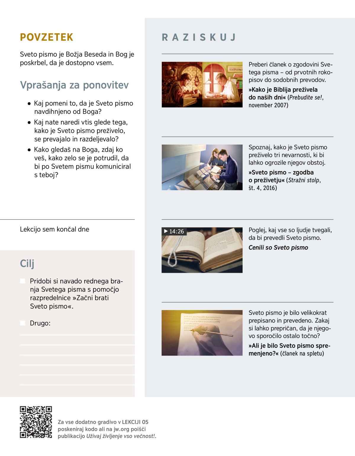 Oglej si VIDEOPOSNETEK. Nato preberi 2. Timoteju 3:16 in razmisli o naslednjih vprašanjih: