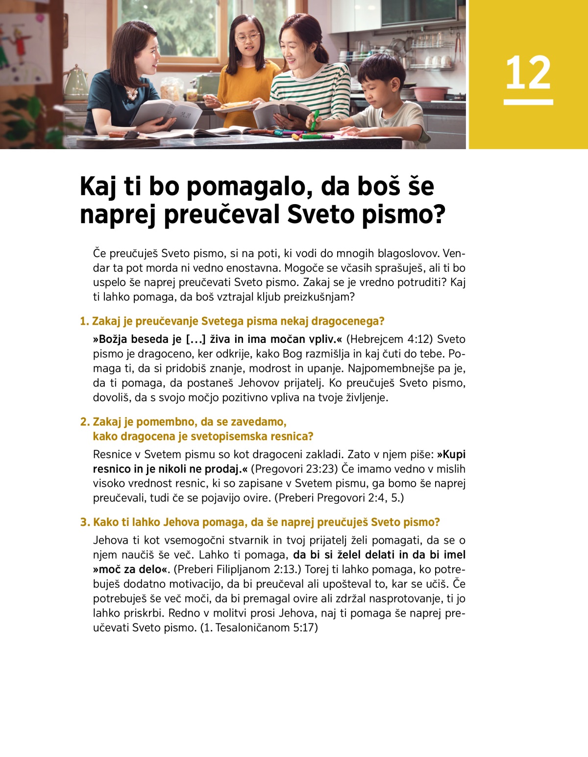 »Božja beseda je […] živa in ima močan vpliv.« (Hebrejcem 4:12) Sveto pismo je dragoceno, ker odkrije, kako Bog razmišlja in kaj čuti do tebe. Pomaga ti, da si pridobiš znanje, modrost in upanje. Najpomembnejše pa je, da ti pomaga, da postaneš Jehovov prijatelj. Ko preučuješ Sveto pismo, dovoliš, da s svojo močjo pozitivno vpliva na tvoje življenje.