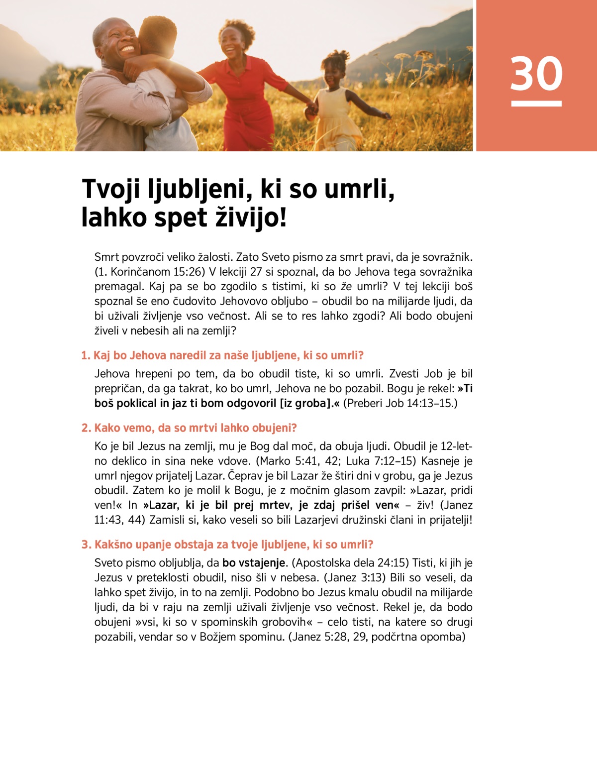 Smrt povzroči veliko žalosti. Zato Sveto pismo za smrt pravi, da je sovražnik. (1. Korinčanom 15:26) V lekciji 27 si spoznal, da bo Jehova tega sovražnika premagal. Kaj pa se bo zgodilo s tistimi, ki so že umrli? V tej lekciji boš spoznal še eno čudovito Jehovovo obljubo – obudil bo na milijarde ljudi, da bi uživali življenje vso večnost. Ali se to res lahko zgodi? Ali bodo obujeni živeli v nebesih ali na zemlji?