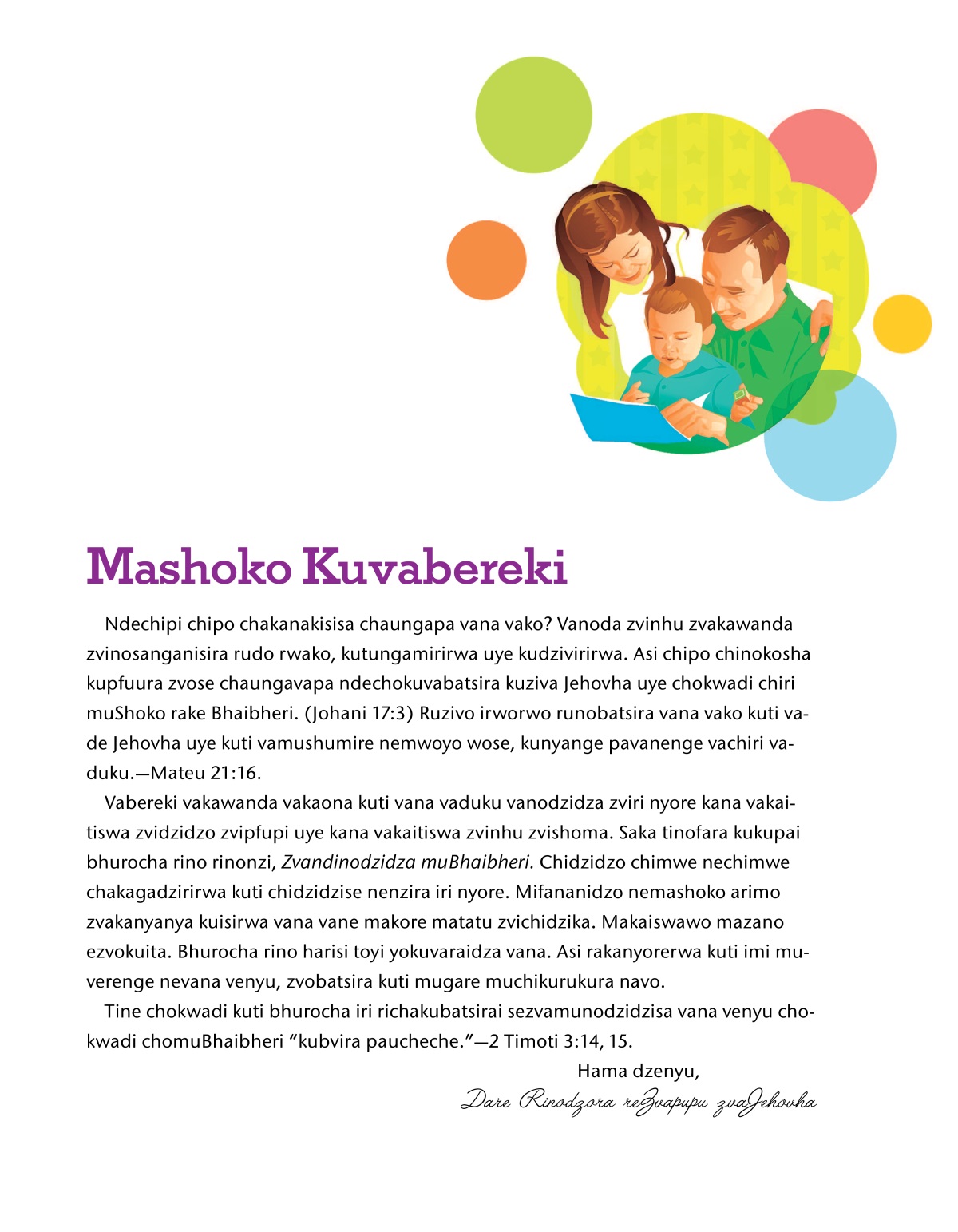 Vabereki vakawanda vakaona kuti vana vaduku vanodzidza zviri nyore kana vakaitiswa zvidzidzo zvipfupi uye kana vakaitiswa zvinhu zvishoma. Saka tinofara kukupai bhurocha rino rinonzi, Zvandinodzidza muBhaibheri. Chidzidzo chimwe nechimwe chakagadzirirwa kuti chidzidzise nenzira iri nyore. Mifananidzo nemashoko arimo zvakanyanya kuisirwa vana vane makore matatu zvichidzika. Makaiswawo mazano ezvokuita. Bhurocha rino harisi toyi yokuvaraidza vana. Asi rakanyorerwa kuti imi muverenge nevana venyu, zvobatsira kuti mugare muchikurukura navo.