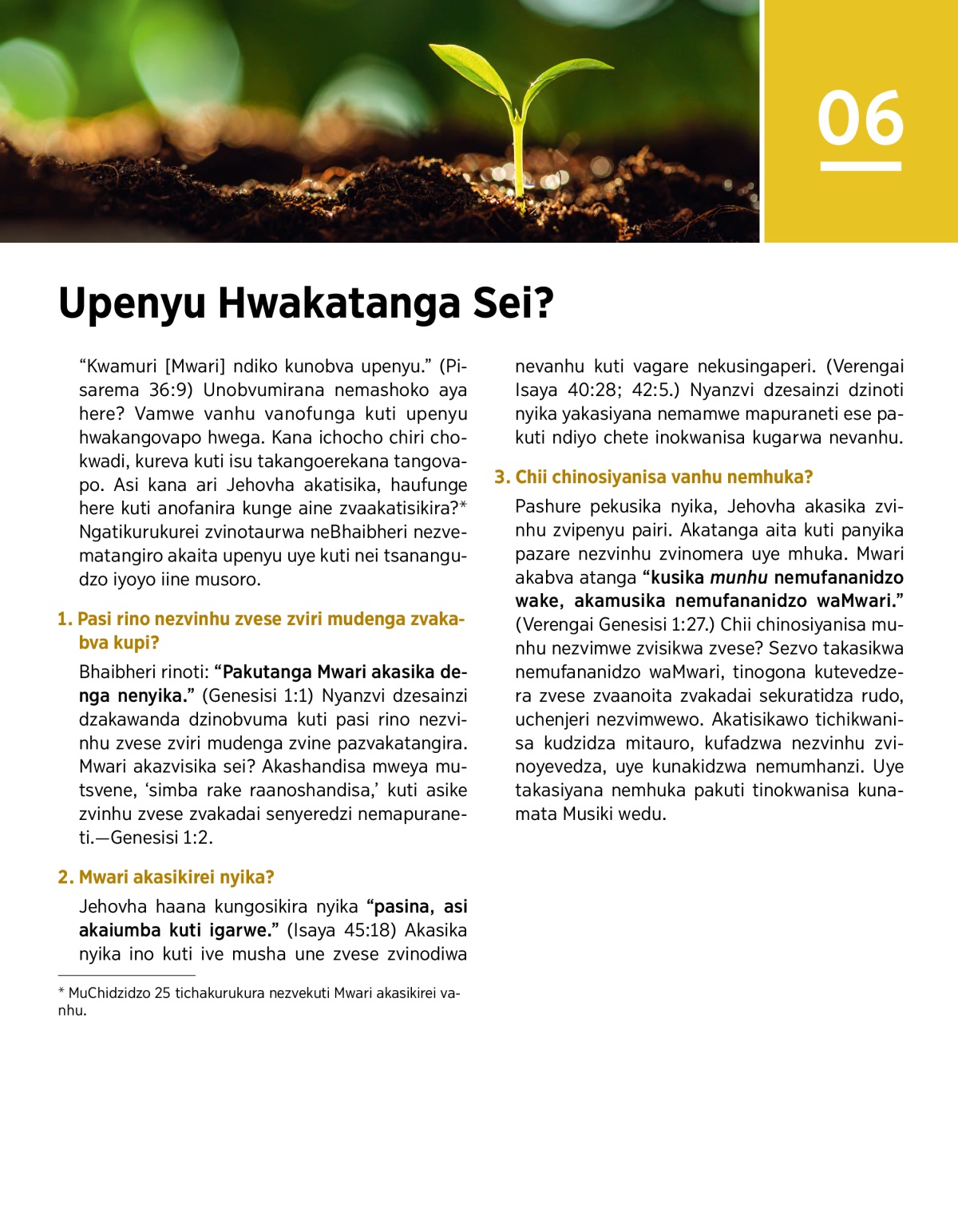“Kwamuri [Mwari] ndiko kunobva upenyu.” (Pisarema 36:9) Unobvumirana nemashoko aya here? Vamwe vanhu vanofunga kuti upenyu hwakangovapo hwega. Kana ichocho chiri chokwadi, kureva kuti isu takangoerekana tangovapo. Asi kana ari Jehovha akatisika, haufunge here kuti anofanira kunge aine zvaakatisikira?a Ngatikurukurei zvinotaurwa neBhaibheri nezvematangiro akaita upenyu uye kuti nei tsanangudzo iyoyo iine musoro.