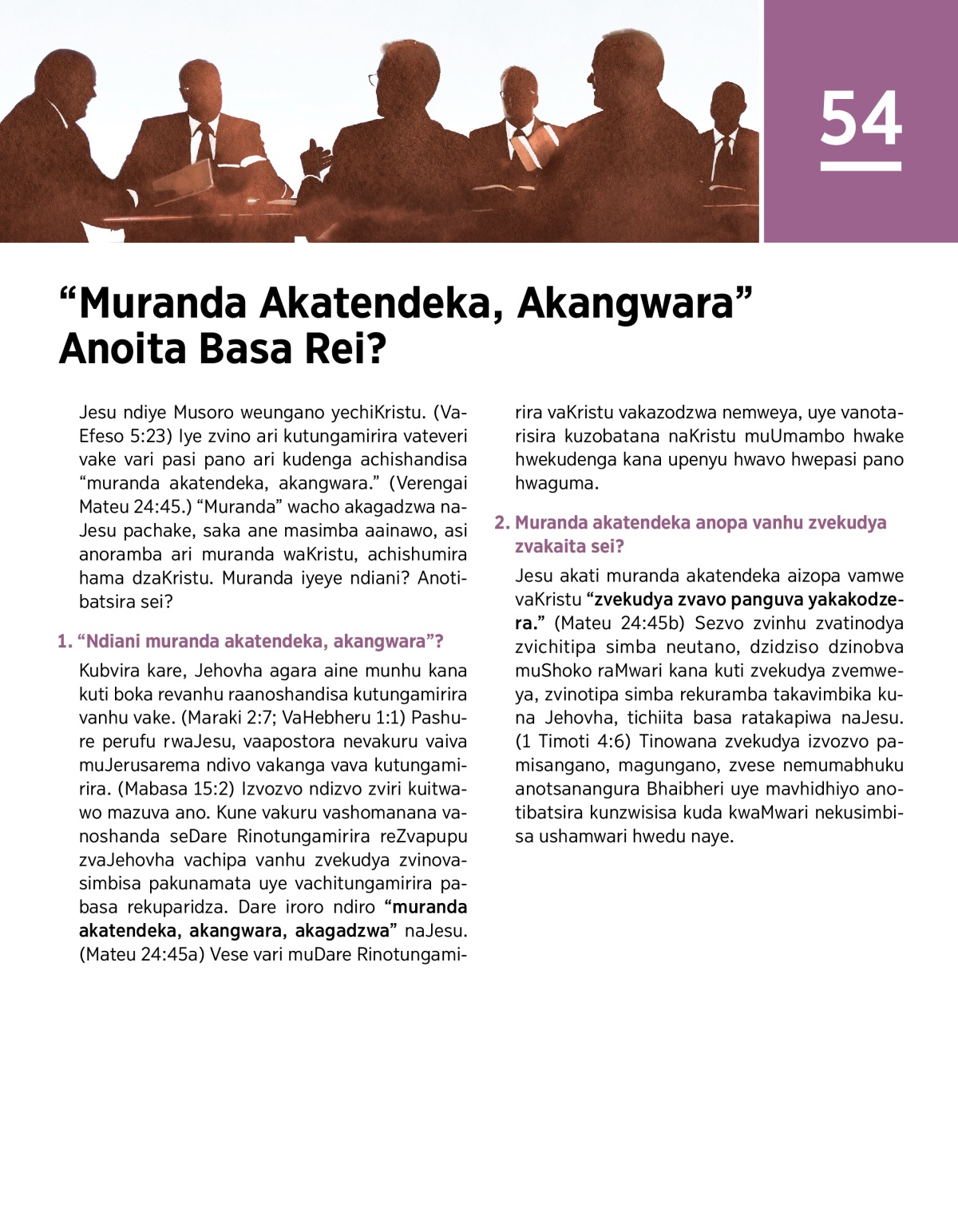 Jesu ndiye Musoro weungano yechiKristu. (VaEfeso 5:23) Iye zvino ari kutungamirira vateveri vake vari pasi pano ari kudenga achishandisa “muranda akatendeka, akangwara.” (Verengai Mateu 24:45.) “Muranda” wacho akagadzwa naJesu pachake, saka ane masimba aainawo, asi anoramba ari muranda waKristu, achishumira hama dzaKristu. Muranda iyeye ndiani? Anotibatsira sei?