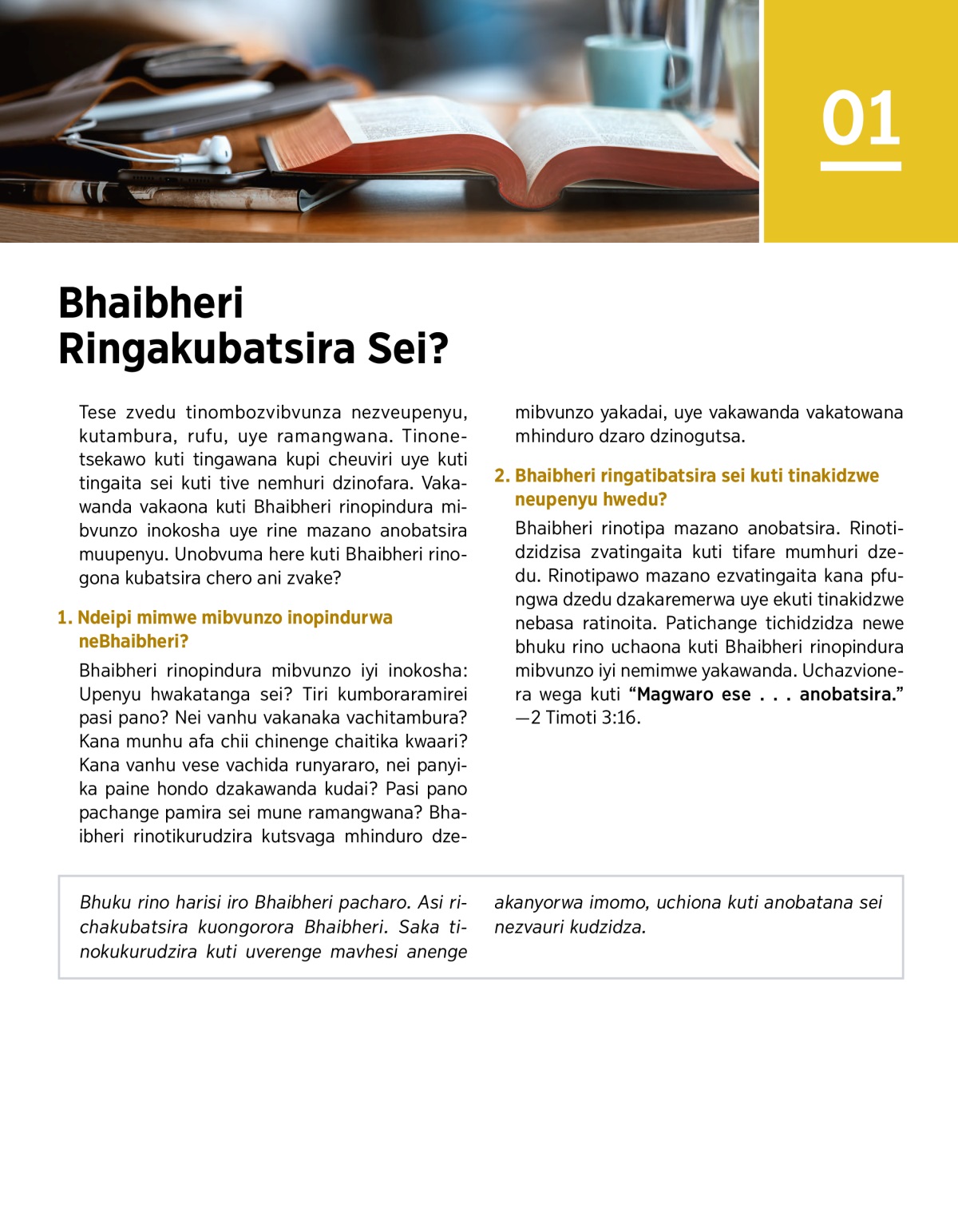 Tese zvedu tinombozvibvunza nezveupenyu, kutambura, rufu, uye ramangwana. Tinonetsekawo kuti tingawana kupi cheuviri uye kuti tingaita sei kuti tive nemhuri dzinofara. Vakawanda vakaona kuti Bhaibheri rinopindura mibvunzo inokosha uye rine mazano anobatsira muupenyu. Unobvuma here kuti Bhaibheri rinogona kubatsira chero ani zvake?