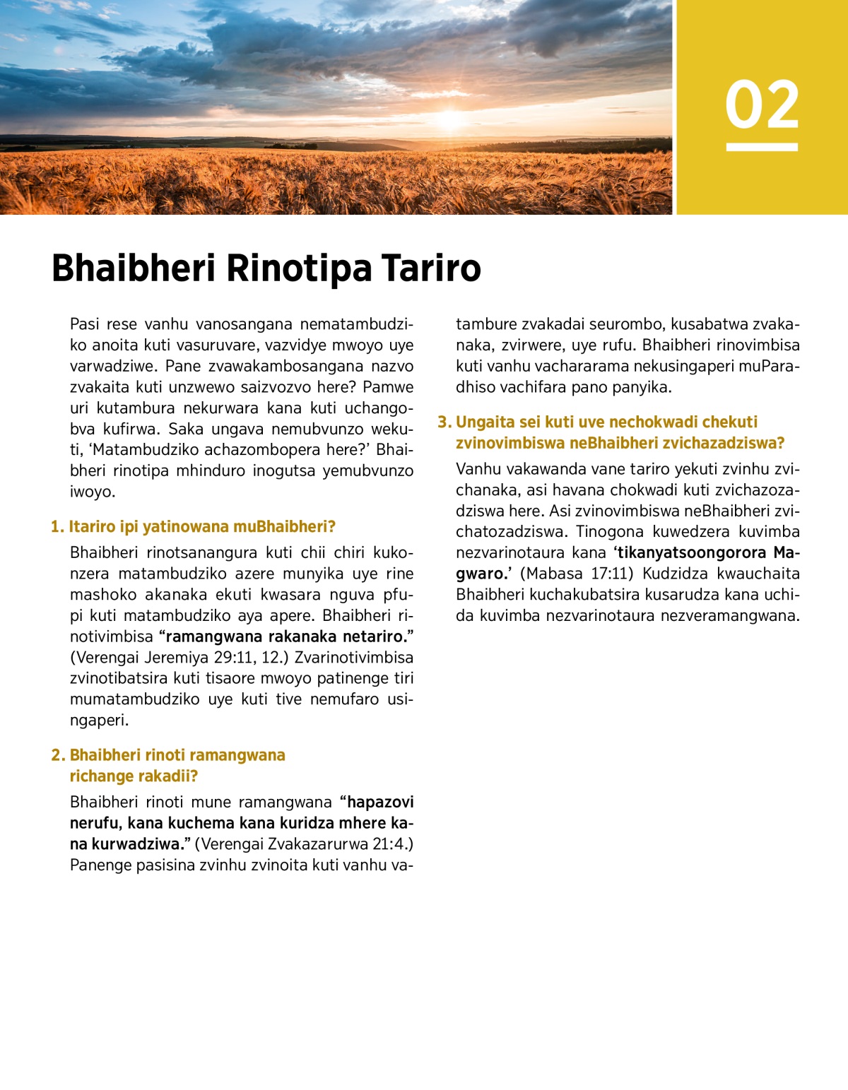 Bhaibheri rinotsanangura kuti chii chiri kukonzera matambudziko azere munyika uye rine mashoko akanaka ekuti kwasara nguva pfupi kuti matambudziko aya apere. Bhaibheri rinotivimbisa “ramangwana rakanaka netariro.” (Verengai Jeremiya 29:11, 12.) Zvarinotivimbisa zvinotibatsira kuti tisaore mwoyo patinenge tiri mumatambudziko uye kuti tive nemufaro usingaperi.