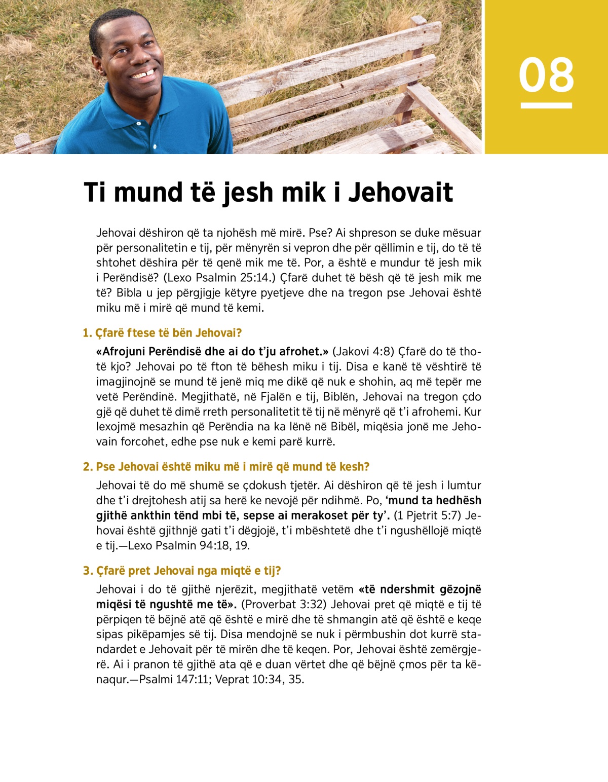 Jehovai dëshiron që ta njohësh më mirë. Pse? Ai shpreson se duke mësuar për personalitetin e tij, për mënyrën si vepron dhe për qëllimin e tij, do të të shtohet dëshira për të qenë mik me të. Por, a është e mundur të jesh mik i Perëndisë? (Lexo Psalmin 25:14.) Çfarë duhet të bësh që të jesh mik me të? Bibla u jep përgjigje këtyre pyetjeve dhe na tregon pse Jehovai është miku më i mirë që mund të kemi.