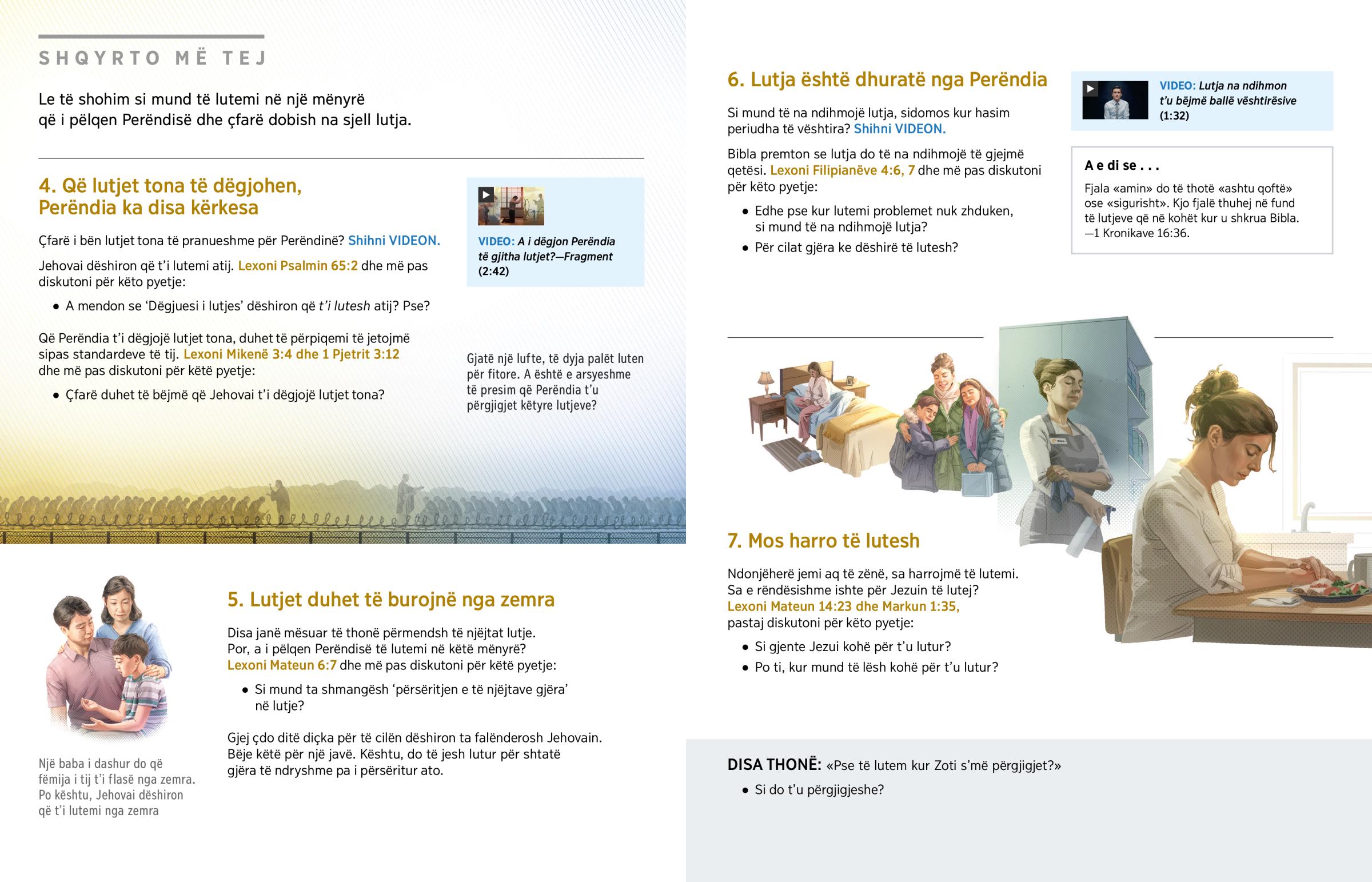 A ke pasur ndonjëherë nevojë për drejtim në jetë? A ke probleme që nuk di t’u japësh zgjidhje? A ke nevojë për ngushëllim dhe shpresë? A do të doje të ndiheshe më afër Jehovait? Lutja mund të të ndihmojë t’i plotësosh të gjitha këto nevoja. Por, si duhet të lutesh? A i dëgjon Perëndia të gjitha lutjet? Çfarë mund të bësh që ai t’i dëgjojë lutjet e tua? Le ta shohim.