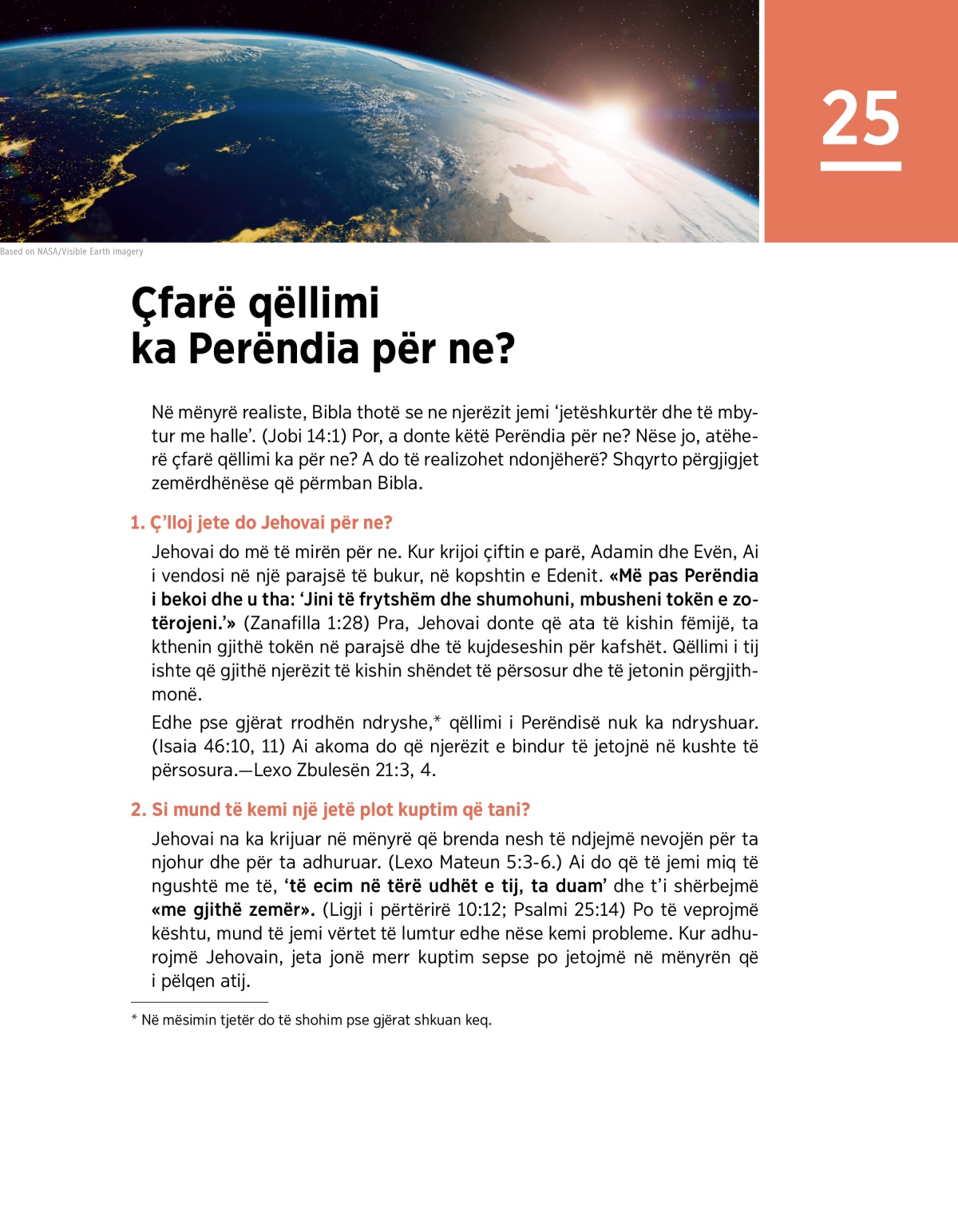 Jehovai do që ne të jetojmë përgjithmonë në kushte të përsosura këtu në tokë. Kur e adhurojmë me gjithë zemër, jeta jonë merr kuptim të vërtetë që tani.