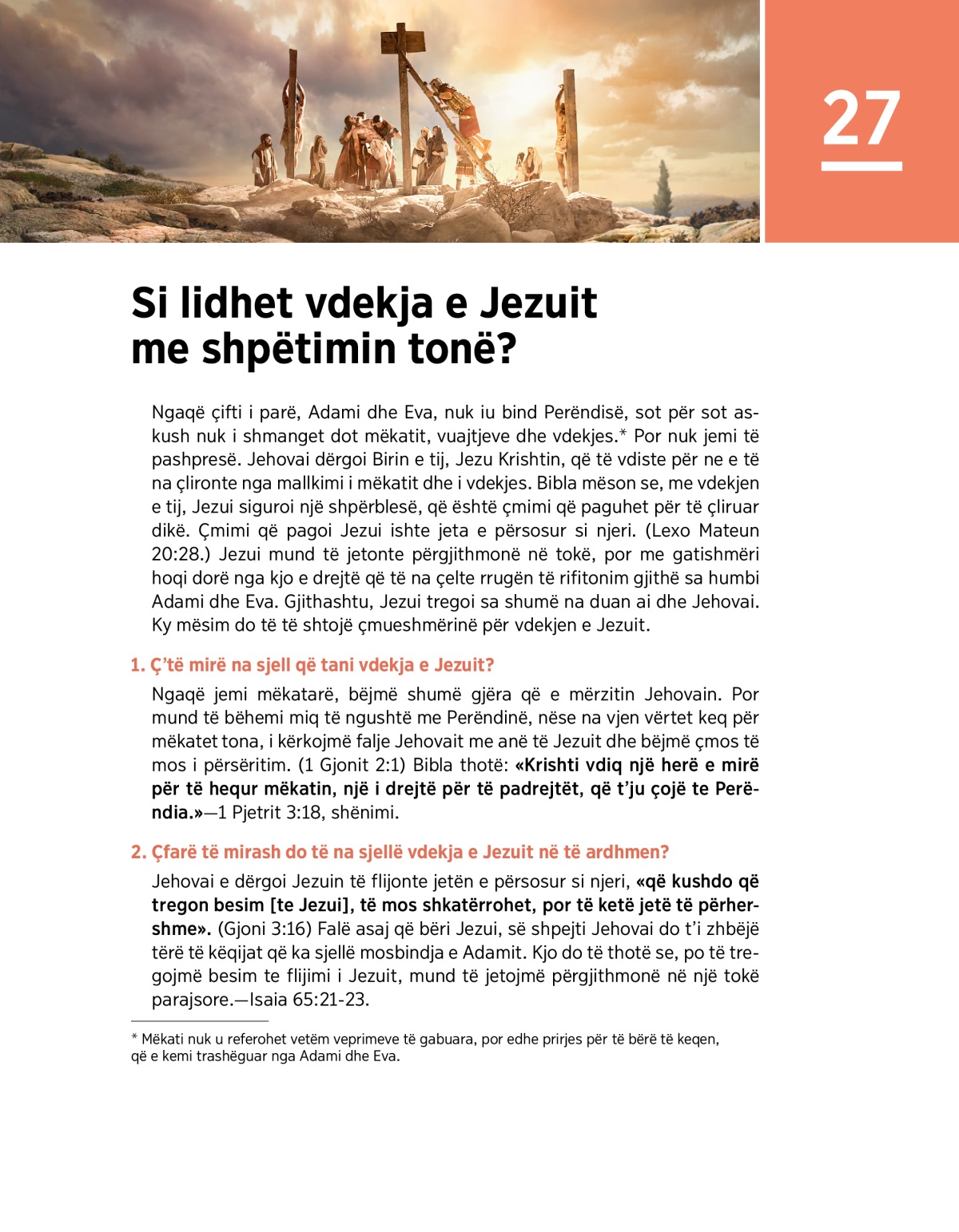 Jehovai e dërgoi Jezuin të flijonte jetën e përsosur si njeri, «që kushdo që tregon besim [te Jezui], të mos shkatërrohet, por të ketë jetë të përhershme». (Gjoni 3:16) Falë asaj që bëri Jezui, së shpejti Jehovai do t’i zhbëjë tërë të këqijat që ka sjellë mosbindja e Adamit. Kjo do të thotë se, po të tregojmë besim te flijimi i Jezuit, mund të jetojmë përgjithmonë në një tokë parajsore.—Isaia 65:21-23.