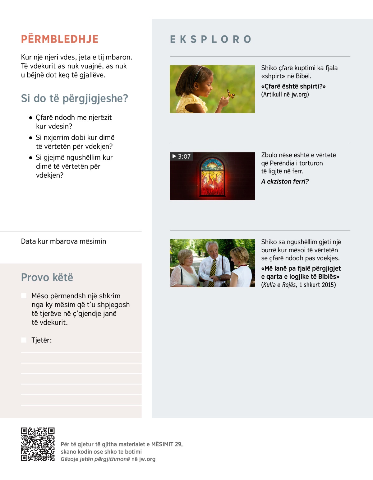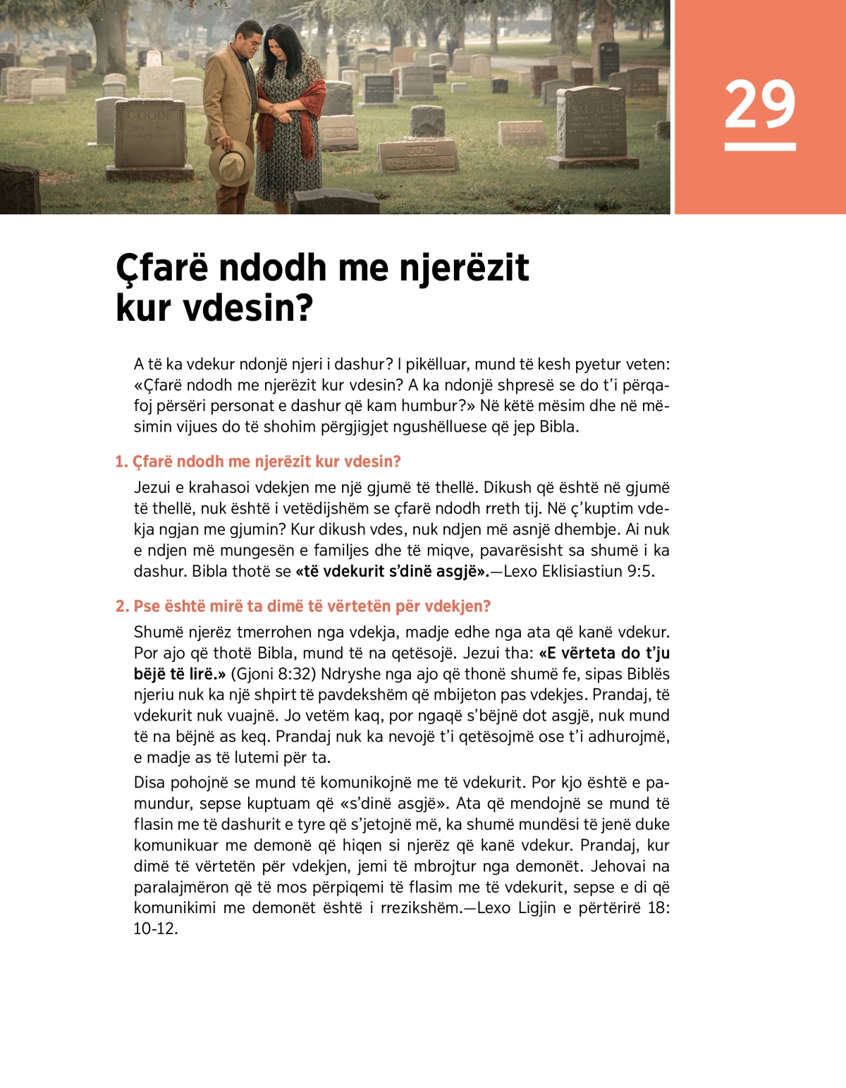 A të ka vdekur ndonjë njeri i dashur? I pikëlluar, mund të kesh pyetur veten: «Çfarë ndodh me njerëzit kur vdesin? A ka ndonjë shpresë se do t’i përqafoj përsëri personat e dashur që kam humbur?» Në këtë mësim dhe në mësimin vijues do të shohim përgjigjet ngushëlluese që jep Bibla.