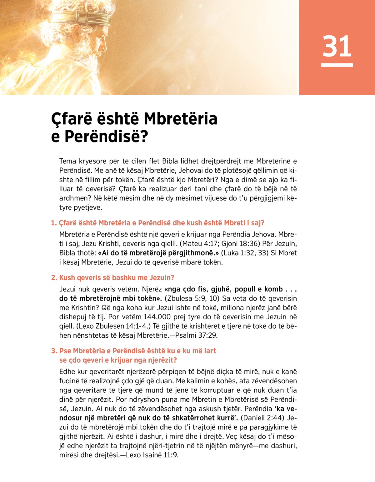 Tema kryesore për të cilën flet Bibla lidhet drejtpërdrejt me Mbretërinë e Perëndisë. Me anë të kësaj Mbretërie, Jehovai do të plotësojë qëllimin që kishte në fillim për tokën. Çfarë është kjo Mbretëri? Nga e dimë se ajo ka filluar të qeverisë? Çfarë ka realizuar deri tani dhe çfarë do të bëjë në të ardhmen? Në këtë mësim dhe në dy mësimet vijuese do t’u përgjigjemi këtyre pyetjeve.